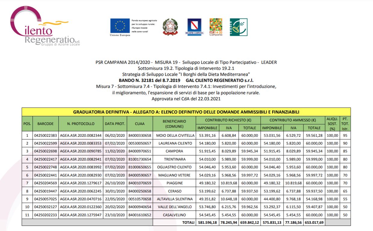 Il Comune di Altavilla Silentina ufficializza il finanziamento accordato per il progetto “Storytelling del Territorio, la storia il nostro futuro. Ideazione Museo della Memoria Storica con Percorso Della Memoria – Quota 424”, per un importo di 54.168,98€. Progetto presentato a bando n.32181 del 8.7.2019, Misura 7 – Sottomisura 7.4 – Tipologia di Intervento 7.4.1 Investimenti per l’Introduzione, il miglioramento, l’espansione dei servizi di base per la popolazione rurale, interna alla Strategia di Sviluppo locale “I Borghi della Dieta Mediterranea” promossa dal GAL Cilento Regeneratio, concretamente vicino ai territori che rappresenta mediante opportunità finanziarie atte a valorizzare il patrimonio dei piccoli e medi territori.