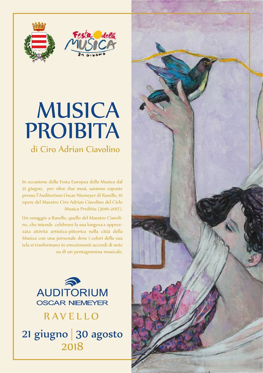 In occasione della Festa Europea della Musica dal 21 giugno, per oltre due mesi,saranno esposte presso l’Auditorium Oscar Niemeyer di Ravello, 10 opere del Maestro Ciro Adrian Ciavolino del Ciclo Musica Proibita (2016-2017).
