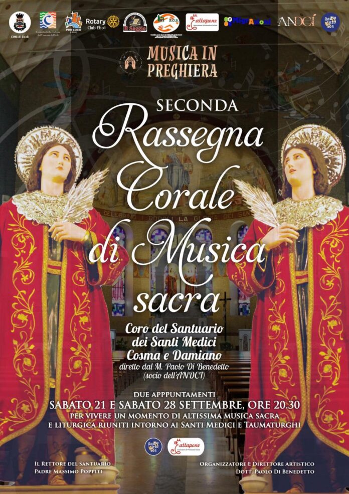 (risalente al XII secolo), e la chiesetta originaria dei Santi Medici, situata di fronte al Santuario e databile al XVII secolo. Ci sarà la possibilità, dunque, di gustare i borghi antichi e di cogliere la peculiarità del Santuario, che si staglia sulla collina di Eboli, in una località archeologicamente imponente, essendo sede delle antiche Fornaci romane del II secolo. Il repertorio dei canti che si ascolteranno spazia dal genere sacro a quello liturgico, a quello barocco e a quello contemporaneo, tutti inerenti alla spiritualità e al tema del Sacro, declinato nelle sue varie forme di lode, carità e amore. Le serate si concluderanno con un canto finale da eseguire tutti insieme, nella coralità, e far sentire un’unica voce di un unico cuore che arde per il Signore.