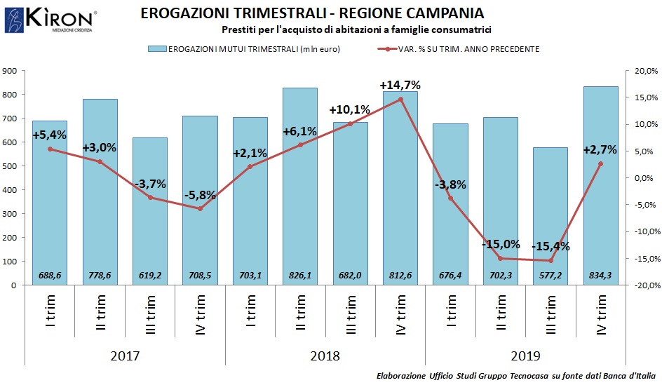 Se si osserva l’andamento delle erogazioni sui 12 mesi, e si analizzano quindi i volumi dell’intero anno solare 2019, la regione Campania mostra una variazione negativa pari a -7,7%, per un controvalore di -233,6 mln di euro. Sono dunque stati erogati in questi ultimi dodici mesi 2.790,2 mln di euro, volumi che rappresentano il 5,71% del totale nazionale.