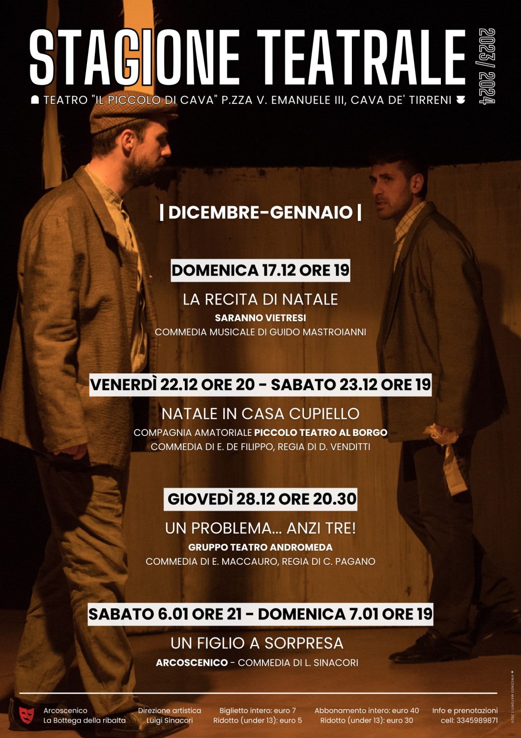 Venerdì 22 e sabato 23 dicembre il quarto appuntamento della Stagione Teatrale 2023/2024 a Cava de’ Tirreni, organizzata dall’Associazione Arcoscenico al Teatro “Il Piccolo di Cava”, in P.zza V. Emanuele III.