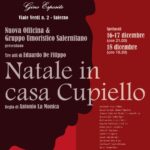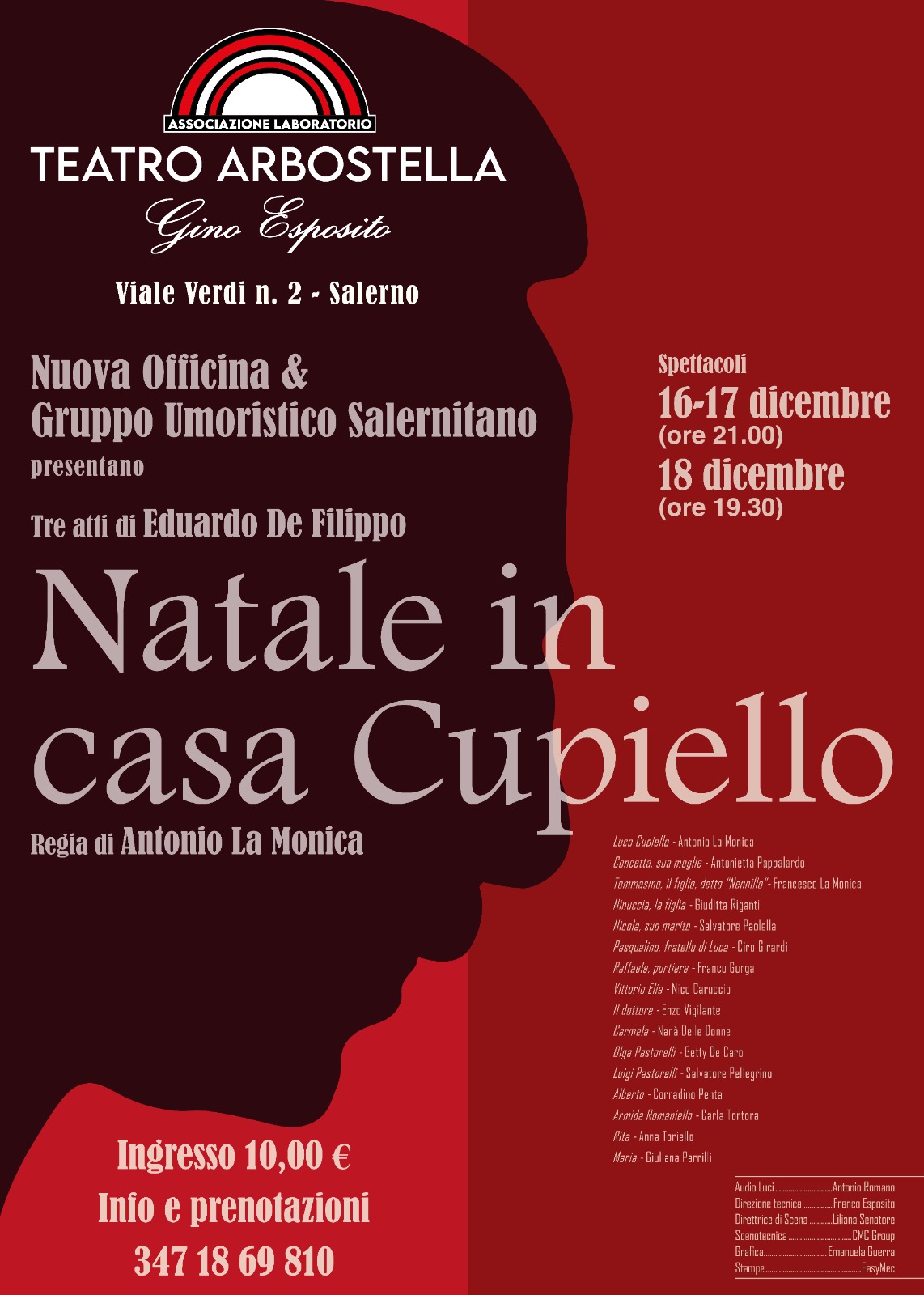 Durante il periodo natalizio il Teatro Arbostella “Gino Esposito”di Salerno si veste a festa e offre al pubblico il più classico dei classici della commedia napoletana “Natale in casa Cupiello”. Da venerdi 16 a domenica18 dicembre il capolavoro di Eduardo De Filippo sarà messo in scena dalla Compagnia “La Nuova Officina” in collaborazione con l’ex Gruppo Umoristico Salernitano (primo gruppo formato dal compianto Gino Esposito), diretta da Antonio La Monica che vestirà i panni di Luca Cupiello, l’ingenuo protagonista che si scontrerà, proprio durante le festività, con la rottura dell’equilibrio che egli credeva regnasse nella sua famiglia.