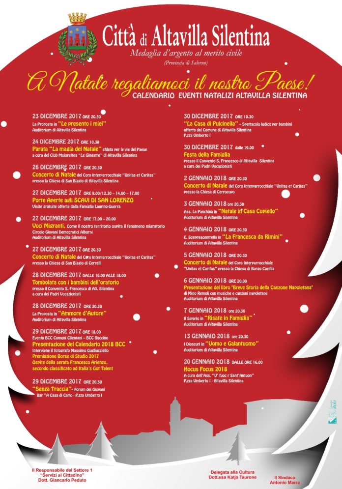 Un grazie va alla compagnia teatrale “La Proposta” di Alfredo Crisci che, congiuntamente all’Amministrazione locale, è riuscita a riportare in auge il teatro in collina, elemento cardine della cultura Altavillese. I ringraziamenti vanno poi estesi alle restanti compagnie: E.Sceppascentrella, Il Sipario, I Dioscuri che porteranno in scena spettacoli teatrali di primo ordine; all’Associazione “La Panchina” per il forte impegno sociale che la contraddistingue, che proporrà un classico del teatro qual è “Natale in Casa Cupiello”; alla Comunità Parrocchiale, guidata da Padre Arley Tobar, che mediante l’allegro coro interparrocchiale Unitas Et Caritas allieterà le serate, uniti a tanti momenti ludici con tombolate e una festa atta a celebrare la famiglia; a Mino Remoli che proporrà una serata cantautoriale accanto alla presentazione del suo libro “Breve storia della canzone napoletana”; al Club Majorettes “Le Ginestre” di Altavilla Silentina che sfileranno, in tutto il loro splendore, in parata per le vie del Paese; alla famiglia Laurino-Guerra per aver organizzato una giornata a “porte aperte” volta alla visita degli Scavi di San Lorenzo; ai Giovani Democratici degli Alburni che attraverso “Voci Migranti” proporranno un’intensa giornata dedicata al tema dell’emigrazione; nonché all’Associazione locale “U fuoc re Sant’Antuon” che proporrà Hocus Focus, evento volto al recupero delle tradizioni in chiave contemporanea. Spazio, inoltre, ai bambini che saranno allietati attraverso la Casa di Pulcinella con spettacoli di balloon art, ventriloquismo, giocoleria e l’allegro teatro dei burattini, con tanto zucchero filato e caramelle che la Befana distribuirà a tutti i piccini. Un’ampia scelta per tutti i target. Non resta che parteciparvi numerosi e … Regalarci il Nostro Paese!