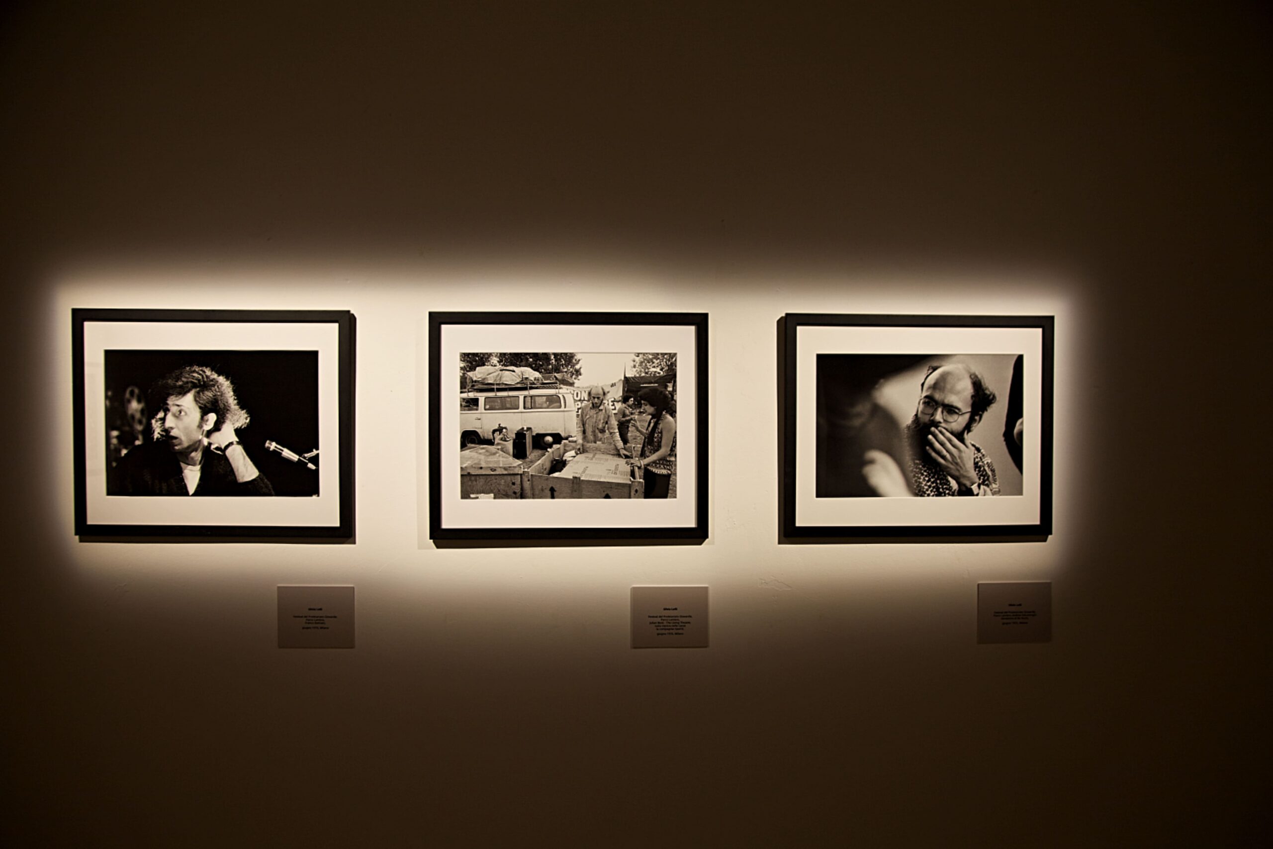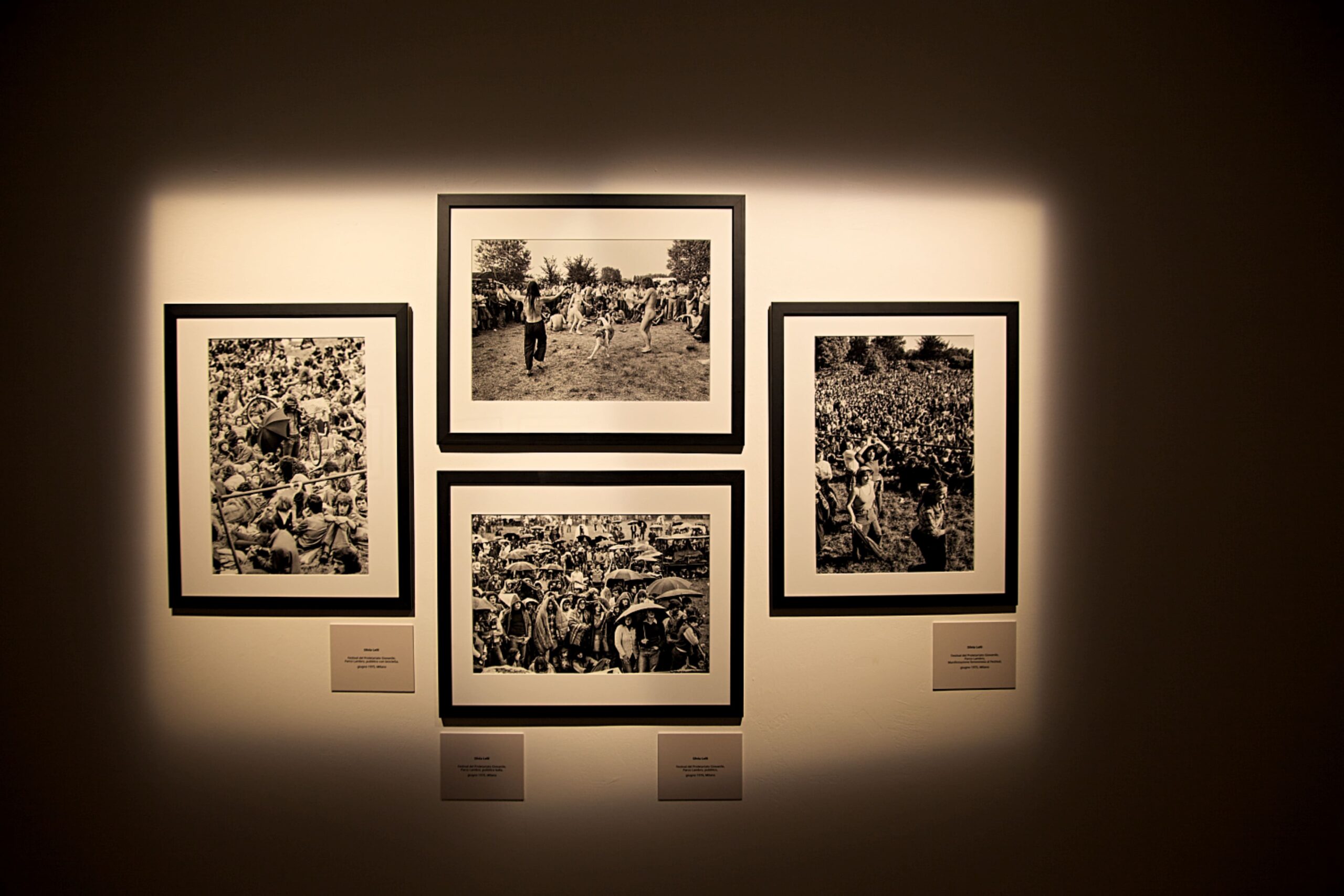 Prima ancora però del lungo lavoro al Teatro e dell’effettivo sodalizio con Roberto Masotti, lo sguardo di Lelli si forma nel vivo delle trasformazioni sociali e culturali di un’epoca in fermento. Gli scatti presenti a Palazzo Fruscione documento la Festa del Proletariato Giovanile organizzata dalla rivista “Re Nudo” al Parco Lambro nel 1976. Un evento che è stato, insieme, festival musicale e spazio politico, luogo di convergenza delle eredità ancora vive del Sessantotto. Nelle sue foto, l’entusiasmo di una generazione che crede ancora nella possibilità di cambiare il mondo e l’inquietudine di chi intuisce che quel cambiamento sarà più difficile, lungo e doloroso del previsto. Solo tre anni prima Fabrizio De André, nella sua Canzone del maggio, evocava lo stesso clima di tensione, trasformando la stagione delle lotte in una riflessione più ampia sul rapporto tra conflitto e responsabilità.