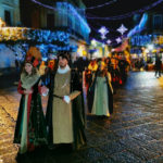 Successivamente, in una Teggiano straordinariamente suggestiva, con i fiocchi di neve ad imbiancare e rendere ancora più stupefacente l’atmosfera di Piazza San Cono, sabato 28 dicembre un manipolo di eroi ha reso omaggio alla Natività onorando il coraggioso pubblico presente. Nemmeno la tormenta di neve è riuscita dunque a fermare Alla Tavola della Principessa Costanza Winter Edition, rendendo anzi indimenticabile ed irripetibile per i presenti lo spettacolo offerto dai Trombonieri del gruppo storico “I Cavalieri della Bolla Pontificia”, che si sono esibiti in una ispiratissima rappresentazione pirotecnica, per poi scortare il Corteo Storico guidato da Antonello Sanseverino e dalla sua sposa Costanza da Montefeltro attraverso tutta Piazza San Cono, fino all’antico Seggio, che ospita il quadro della Natività dello splendido Presepe dell’Abbazia di Montevergine. Senza fiocchi di neve ma ugualmente affascinante l’ultima replica, andata in scena domenica 29 dicembre: a conferma che il fascino della Principessa Costanza, abbinata alla bellezza della Città d’Arte del Vallo di Diano, travalica le stagioni e le condizioni meteo. Altro esperimento riuscito è stato quello di alternare gli interpreti di Costanza e Antonello: e così tre coppie diverse, tutte giovanissime, si sono alternate negli iconici ruoli. Applausi meritati dunque per Maria Helena Federico e Tommaso Mangieri, Arianna Giardullo e Rocco Pio De Paola, e Alessia Pericolo e Rocco Sabini. Alla Tavola della Principessa Costanza Winter Edition è anche questo: audacia di intraprendere nuovi percorsi. Dove il premio per gli arditi e gli ardimentosi capaci di sfidare le strade più battute e convenzionali, sono emozioni e suggestioni che non hanno eguali.