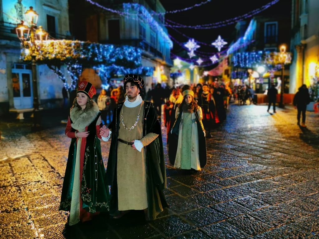 Successivamente, in una Teggiano straordinariamente suggestiva, con i fiocchi di neve ad imbiancare e rendere ancora più stupefacente l’atmosfera di Piazza San Cono, sabato 28 dicembre un manipolo di eroi ha reso omaggio alla Natività onorando il coraggioso pubblico presente. Nemmeno la tormenta di neve è riuscita dunque a fermare Alla Tavola della Principessa Costanza Winter Edition, rendendo anzi indimenticabile ed irripetibile per i presenti lo spettacolo offerto dai Trombonieri del gruppo storico “I Cavalieri della Bolla Pontificia”, che si sono esibiti in una ispiratissima rappresentazione pirotecnica, per poi scortare il Corteo Storico guidato da Antonello Sanseverino e dalla sua sposa Costanza da Montefeltro attraverso tutta Piazza San Cono, fino all’antico Seggio, che ospita il quadro della Natività dello splendido Presepe dell’Abbazia di Montevergine. Senza fiocchi di neve ma ugualmente affascinante l’ultima replica, andata in scena domenica 29 dicembre: a conferma che il fascino della Principessa Costanza, abbinata alla bellezza della Città d’Arte del Vallo di Diano, travalica le stagioni e le condizioni meteo. Altro esperimento riuscito è stato quello di alternare gli interpreti di Costanza e Antonello: e così tre coppie diverse, tutte giovanissime, si sono alternate negli iconici ruoli. Applausi meritati dunque per Maria Helena Federico e Tommaso Mangieri, Arianna Giardullo e Rocco Pio De Paola, e Alessia Pericolo e Rocco Sabini. Alla Tavola della Principessa Costanza Winter Edition è anche questo: audacia di intraprendere nuovi percorsi. Dove il premio per gli arditi e gli ardimentosi capaci di sfidare le strade più battute e convenzionali, sono emozioni e suggestioni che non hanno eguali.