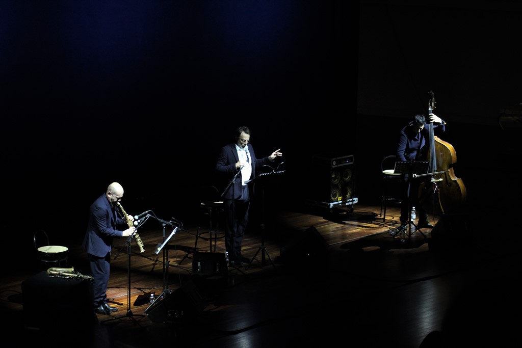 La Città della Musica ha accolto l’attore napoletano con una giornata tiepida e soleggiata, giusto coronamento del viaggio onirico attraverso l’Inferno, il Purgatorio e il Paradiso della Commedia. La pièce in prima assoluta, che si inserisce negli eventi invernali organizzati dalla Fondazione Ravello, ha calato alcuni dei versi più famosi dell’opera somma di Dante in un’atmosfera inedita e suggestiva creata dalla musica jazz. Alle composizioni di John Coltrane e di alcuni standard celeberrimi, si sono alteranti momenti di improvvisazione che hanno trasformato la sala dell’Auditorium Niemeyer in un luogo metafisico e surreale dove la Divina Commedia è divenuto altro.