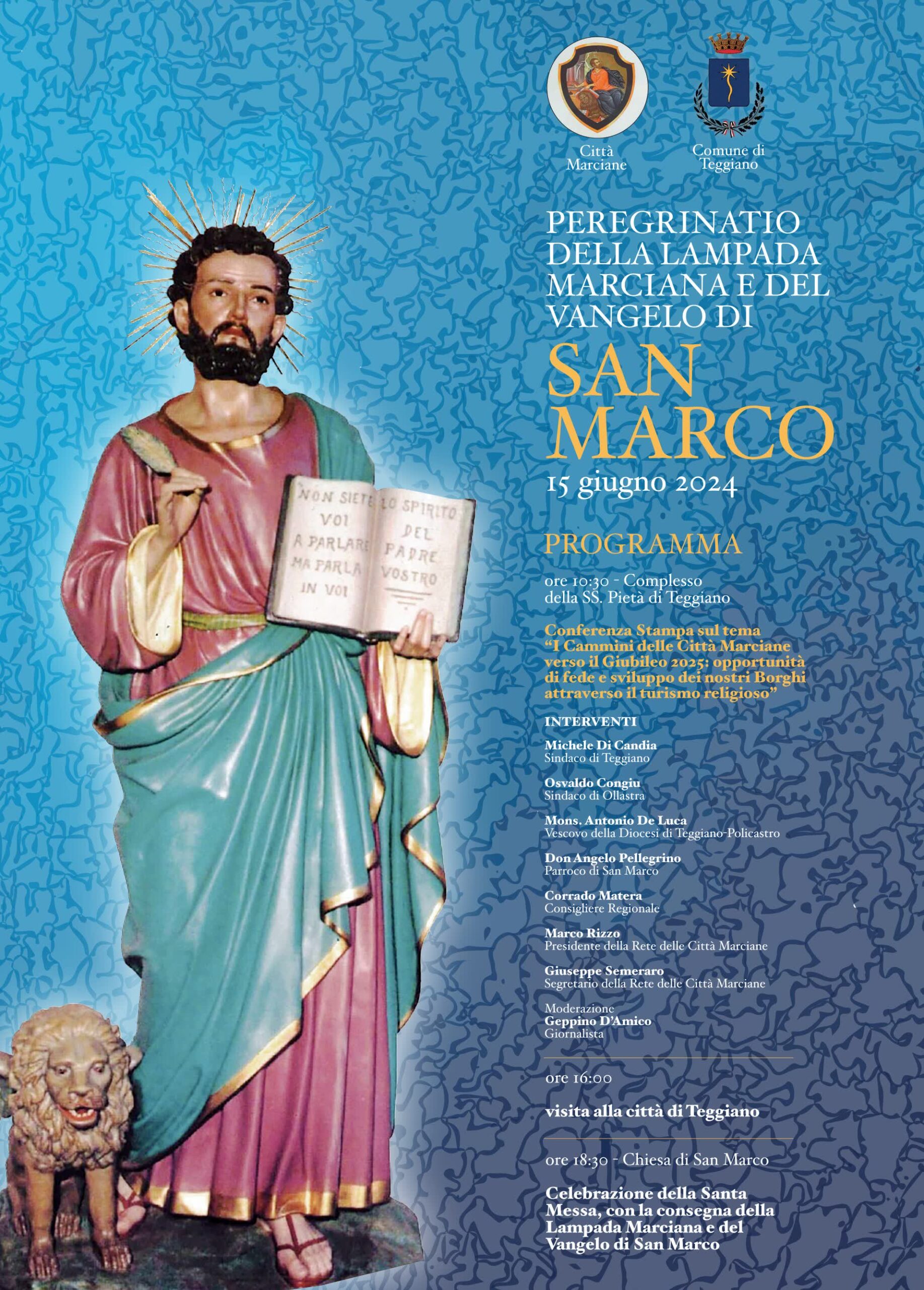L’iniziativa ufficializzerà l’adesione da parte del Comune di Teggiano alla “Rete delle Città Marciane”, avvenuta a gennaio. L’Associazione attualmente riunisce 25 Comuni, con la finalità di promuovere il culto di San Marco e, contemporaneamente, valorizzare anche i territori, le bellezze storico artistiche e le produzioni enogastronomiche dei Comuni aderenti, favorendone lo sviluppo turistico, religioso e culturale. Dalla Sardegna, in una simbolica staffetta tra devozione e promozione, sarà il sindaco Osvaldo Congiu ad accompagnare la Lampada Marciana e il Vangelo di San Marco dalla città di Ollastra (OR), precedente tappa della “Peregrinatio”, alla sua nuova destinazione, il Comune di Teggiano (SA). L’evento sarà l’occasione per presentare alla comunità teggianese la “Rete”, e vedrà anche la consegna della Bandiera Associativa.