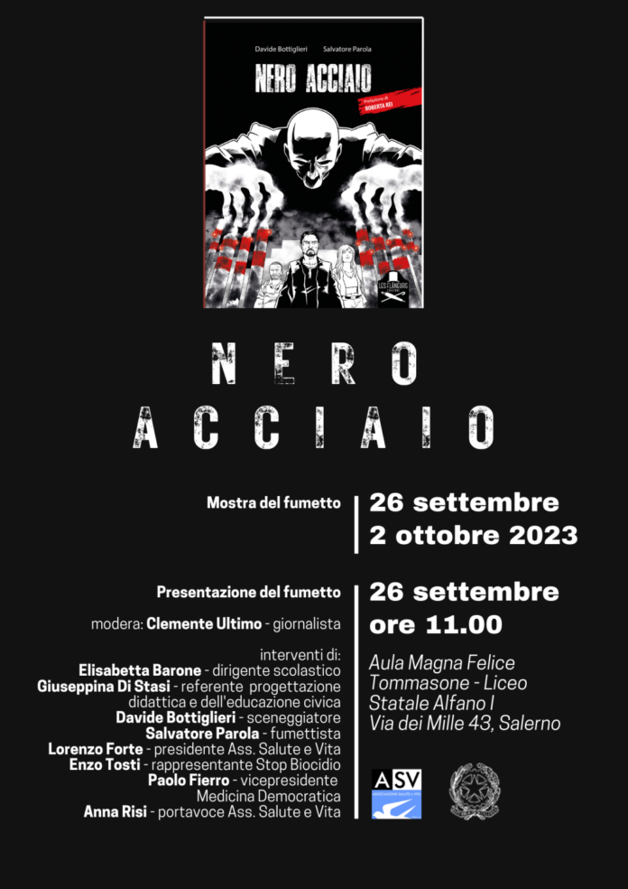 Dal 26 settembre al 2 ottobre il Liceo Statale “Alfano 1” di Salerno ospiterà le istallazioni del fumetto “Nero Acciaio” (Les Flaneurs Edizioni), scritto da Davide Bottiglieri e disegnato da Salvatore Parola.