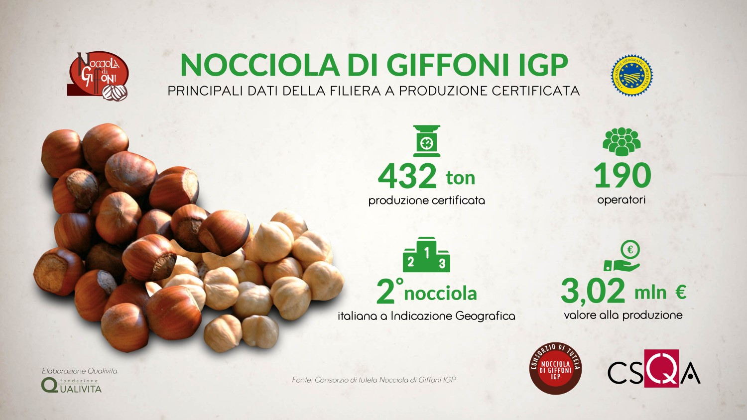La Nocciola di Giffoni IGP, celebre nel mondo per sapore, dolcezza e aroma è la 2° nocciola a Indicazione Geografica italiana, grazie a 432 tonnellate di prodotto certificato capaci di generare un valore alla produzione di 3,02 milioni di euro, frutto del lavoro di 190 operatori. Un’eccellenza particolarmente apprezzata per la trasformazione industriale perché resiste bene a tostatura, calibratura e pelatura dando vita a prodotti lavorati e semilavorati di altissima qualità (Fonte Consorzio di Tutela Nocciola di Giffoni IGP).