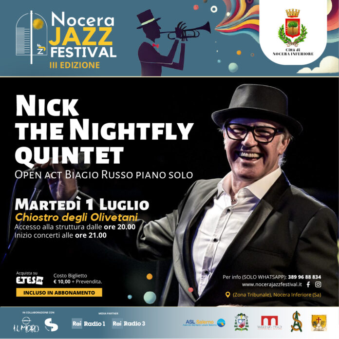 Artista di straordinaria sensibilità, Nick The Nightfly è cantante, chitarrista e compositore — tra i suoi brani più noti, “Semplicemente”, scritto per Andrea Bocelli — oltre che iconica voce radiofonica, grazie al programma cult “Monte Carlo Nights”, che da oltre vent’anni anticipa e racconta le nuove tendenze musicali internazionali. Ad accompagnarlo sul palco, una formazione di altissimo livello: Amedeo Ariano alla batteria; Francesco Puglisi al basso; Jerry Popolo al sax e Pietro Lussu al pianoforte.