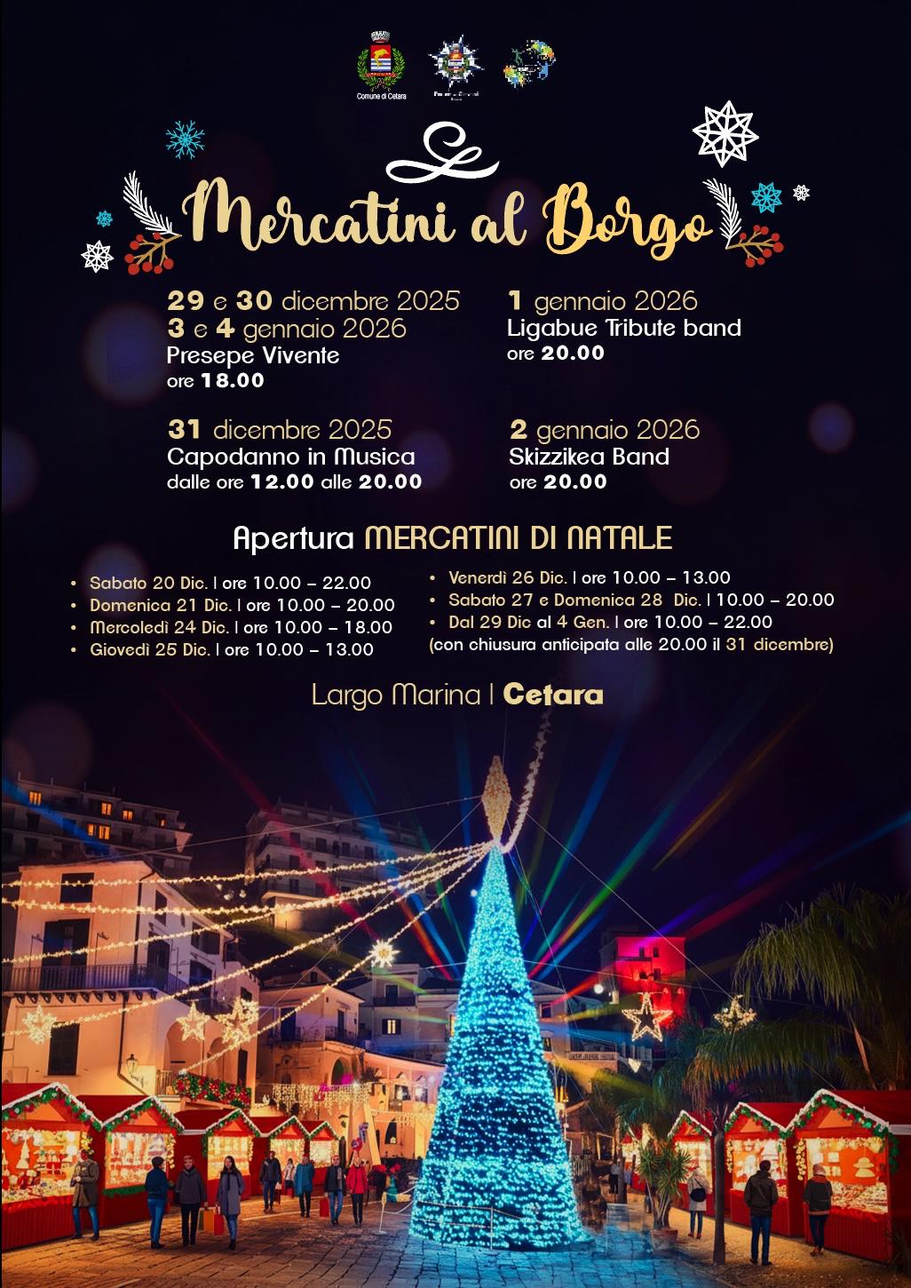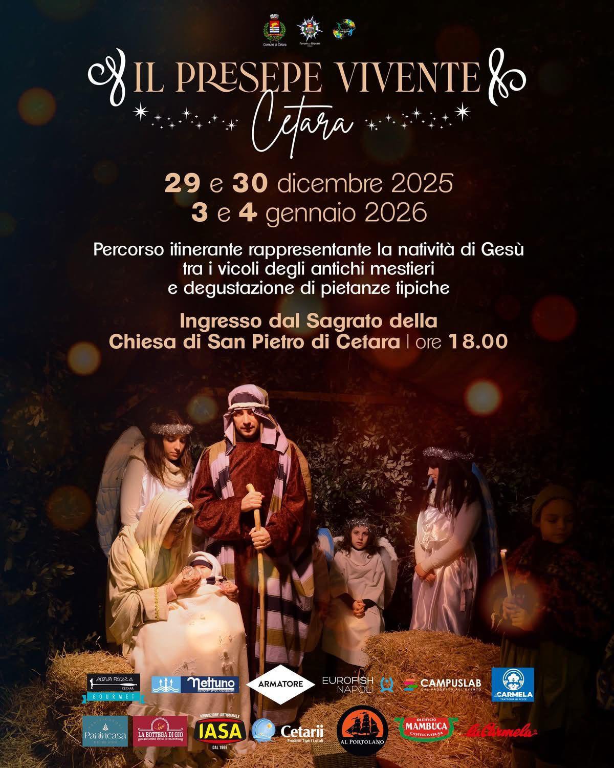 Tra gli appuntamenti più attesi tornano i “Mercatini al Borgo”, in programma dal 20 dicembre, e fino al 4 gennaio in Largo Marina, a tenere compagnia per tutto il giorno, dalle 10 alle 22. Insieme al Forum dei Giovani, un percorso tra artigianato, street food e prodotti tipici locali che trasformerà il centro di Cetara in un vivace villaggio natalizio affacciato sul mare, con stand dedicati a creazioni artistiche, specialità gastronomiche e tante idee regalo. A solo pochi passi, ad arricchire l’atmosfera ci sarà il Presepe Vivente “Tra le vie degli antichi mestieri”, in scena il 29 e 30 dicembre con replica il 3 e 4 gennaio (ore 18), nel Borgo Storico di San Giacomo per dare vita a spettacoli di artisti di strada ed eventi legati alla cultura tradizionale costiera. Un itinerario suggestivo tra i vicoli, con scene dedicate alla Natività, ai mestieri di una volta e alle degustazioni di piatti tradizionali, per raggiungere il sagrato della Chiesa di San Pietro Apostolo. La seconda metà del calendario delle Notti Azzurre prenderà il via sabato 20 dicembre con un doppio appuntamento: alle 16, nella Sala Ave Maria, per una “Tombolata AC” a cura dell’Azione Cattolica, e alle 19, per il “Concerto di Natale” nella Chiesa di San Pietro Apostolo. Domenica 21 dicembre, dalle 10, Largo Marina ospita “Aspettando Babbo Natale”, con giochi e intrattenimento per i bambini. La vigilia di Natale, mercoledì 24 dicembre, sarà scandita dalla Santa Messa, alle 23.30 nella Grotta di Largo Marina, per vivere insieme il momento solenne della nascita del Bambino Gesù e la calata della stella cometa. Dal 25 al 28 dicembre e l’1 gennaio, la Compagnia Teatrale Cetarese porta in scena “Tre pecore viziose” di Eduardo Scarpetta (Sala Benincasa, ore 20), un classico che coniuga ironia e tradizione. Gran finale, il 31 dicembre, Cetara saluterà il 2025 per prepararsi ad accogliere il 2026 già dalle 12 con il grande Capodanno in piazza: musica live, spettacoli, brindisi e tanta allegria in Largo Marina, per un lungo aperitivo fino alle 20.  Il nuovo anno si apre giovedì 1 gennaio con “Mercatini in Musica”, col tributo a Ligabue (ore 20), seguito dal live music della band Skizzekea il giorno dopo, venerdì 2 gennaio, sempre alla stessa ora in Largo Marina. Lunedì 5 gennaio, torna “Aspettando la Befana”, con attività e sorprese per i bambini (ore 10), mentre venerdì 9 gennaio sarà il momento della “Super Tombolata” a cura del Forum dei Giovani (Sala Benincasa, ore 18). Il Natale è anche solidarietà, domenica 11 gennaio (ore 19), la Chiesa di San Pietro Apostolo ospiterà lo “Spettacolo di Beneficenza” dell’Azione Cattolica. Il mese proseguirà con il “CineForum for Kids” (venerdì 16, 23 e 30 gennaio) e con il ritorno di “Calice” e le sue masterclass il 23 gennaio, sempre alla Torre Vicereale negli spazi del Museo Cantina, per l’ultimo appuntamento dedicato agli appassionati della buona tavola, per discutere di gastronomia, enologia e dei tanti abbinamenti cibo-vino possibili con l’ingrediente principe, la colatura di alici. Sabato 17 gennaio, spazio alla cultura con il Premio letterario “…e adesso raccontami… Natale” ideato da Alfonso Bottone, alla Sala Benincasa (ore 18), che come ogni anno premierà le migliori opere letterarie e visive dedicate al periodo natalizio. La rassegna si concluderà a febbraio con gli ultimi appuntamenti di “CineForum for Kids (venerdì 6, 13, 20 e 27) e le proiezioni cinematografiche dedicate ai bambini e le loro famiglie. «Le Notti Azzurre rappresentano un momento speciale per la nostra comunità – afferma il Sindaco di Cetara, Fortunato Della Monica – Un’occasione per valorizzare le tradizioni, accogliere visitatori e vivere insieme il borgo anche d’inverno. Cetara è un luogo che sa offrire calore, bellezza e autenticità in ogni stagione. A nome dell’Amministrazione comunale auguro a tutti un sereno Natale e un Nuovo Anno ricco di pace, speranza e condivisione».