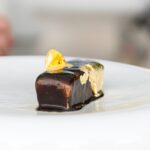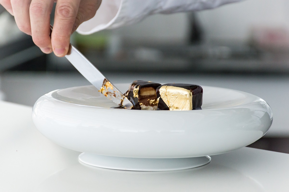 Un dessert realizzato con un croccante di riso soffiato salato e tre cremosi a base di cioccolati selezionatissimi (fondente, al latte e bianco) ricoperto con una glassa al cioccolato e una foglia d’oro 24 kt: tanto bello da vedere quanto buono da mangiare! E’ il “lingotto d’oro” di Nunzio Spagnuolo, chef del ristorante “Rada” di Positano.