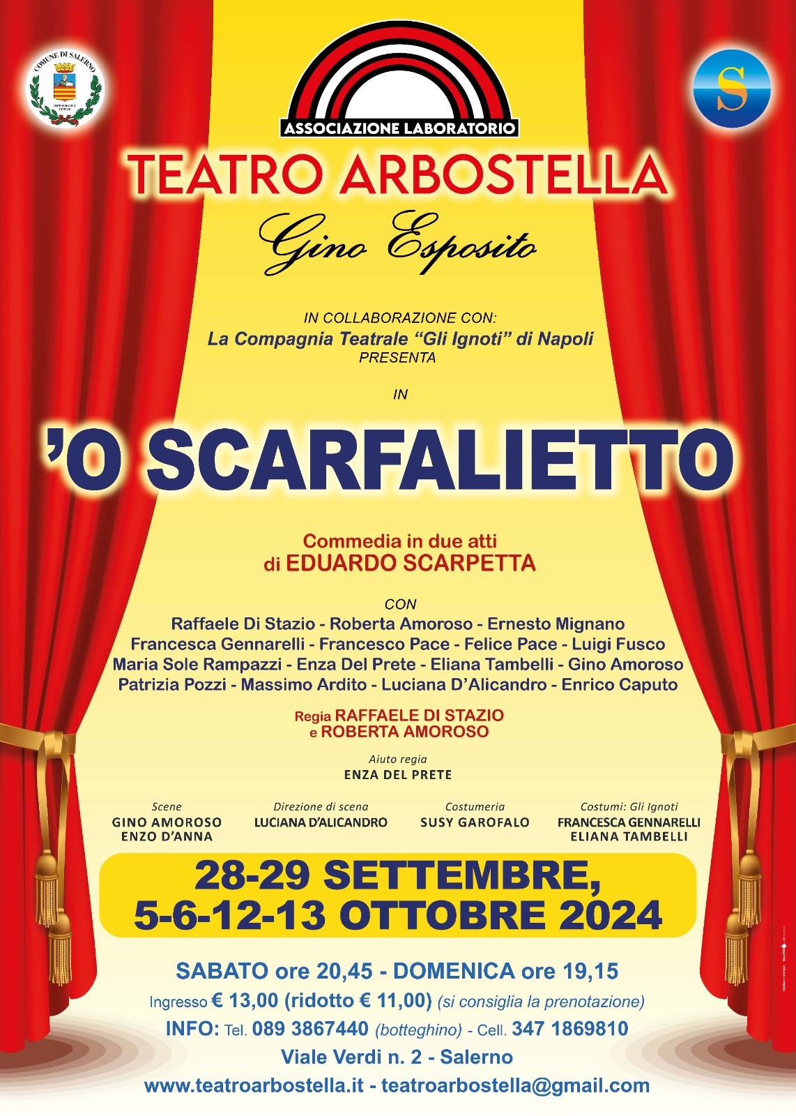 Debutto affidato alla storica Compagnia Gli Ignoti di Napoli, che quest’anno delizia il pubblico della struttura di Viale Verdi con ‘O Scarfalietto , una delle commedie più divertenti di Eduardo Scarpetta.