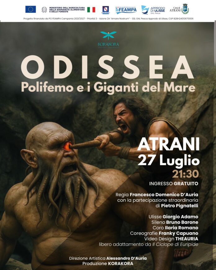 Lo spettacolo è organizzato da Alfonso Cavaliere, con la regia e il video design di Francesco Domenico D’Auria. “Odissea,, Polifemo e Giganti del Mare – racconta il regista – è un esperimento scenico che nasce dall’adattamento del Ciclope di Euripide, l’unico dramma satiresco giunto integro fino a noi, qui riscritto per un cast di attori, cantanti e danzatori. Il cuore della messinscena è una narrazione corale e visionaria, in equilibrio tra parola classica e linguaggi contemporanei. L’elemento centrale dello spettacolo è il videomapping immersivo proiettato direttamente sulla maestosa roccia di Atrani, che si trasforma in un personaggio vivo e mutevole. Le immagini sono state realizzate con le più avanzate tecnologie di generazione visiva tramite intelligenza artificiale, permettendo una resa scenografica fluida, onirica, quasi liquida: la grotta del ciclope prende forma davanti agli occhi degli spettatori, i giganti emergono dalle pietre, i mari si agitano, e la memoria del mito si rinnova in tempo reale. Questa scelta di unire drammaturgia antica e strumenti digitali è una dichiarazione di intenti: la classicità non è un relitto, ma un’onda da attraversare, reinventare, danzare. L’esperienza è pensata come un rito collettivo e multisensoriale, che fonde recitazione, canto e movimento in un racconto stratificato, potente, aperto alla meraviglia.”