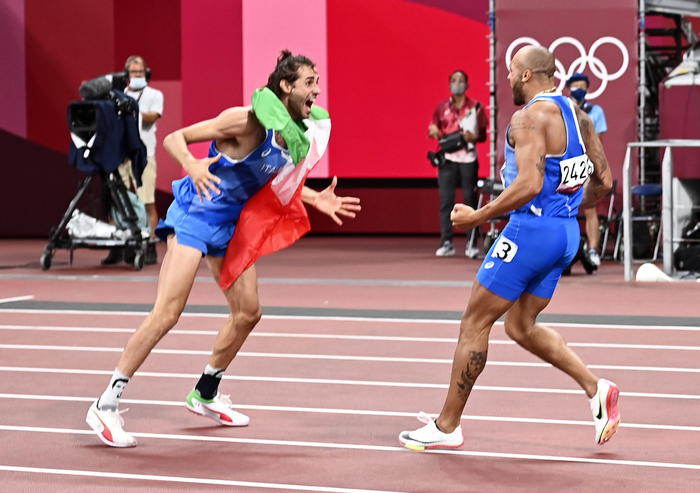 I dieci minuti che cambiarono lo sport italiano sono cominciati alle 21:42 di Tokyo, quando l’arbitro ha chiamato Gianmarco Tamberi e il campione del Qatar, Mutaz Barshim, fermi a quota 2,37 m e ormai irraggiungibili nella sfida per l’oro del salto in alto: spareggio o ex-aequo? Uno sguardo fra i due e la vittoria condivisa è stata immediata, travolgente. Trascorrono poco più di 600 secondi e alle 21:53 partono i 100 metri, i primi della storia olimpica con un italiano ai blocchi. Un ragazzo che i media stranieri definiscono “arrivato dal nulla”, nato a El Paso e cresciuto a Desenzano del Garda, in provincia di Brescia, fa con le mani il segno del corridoio diritto davanti a sé. Gli occhi guardano diritto, verso il traguardo. Si tocca le spalle, un rito. Lo sguardo è sicuro, sereno. Parte e arriva in 9 secondi e 80″, nuovo record europeo. Un’Olimpiade fin qui piena di polemiche e preoccupazioni, tante medaglie ma pochi ori per l’Italia, diventa l’avventura più incredibile. Il mondo scopre che sono italiani l’uomo più veloce e quello che salta più in alto, come li celebra subito il presidente del Coni, Giovanni Malagò, giustamente commosso.