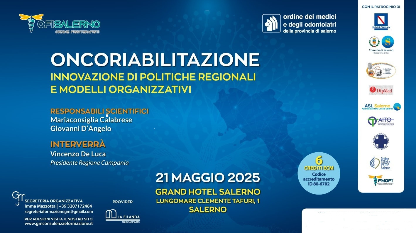 Si terrà il prossimo 21 maggio, presso il Grand Hotel Salerno, a partire dalle ore 900, il convegno dal titolo “Oncoriabilitazione – Innovazione di politiche regionali e modelli organizzativi”, organizzato congiuntamente dall’Ordine dei Fisioterapisti di Salerno e dall’Ordine dei Medici Chirurghi e Odontoiatri di Salerno. L’evento sarà un’occasione per approfondire l’importanza dell’onco-riabilitazione e della presa in carico precoce del paziente oncologico, con particolare attenzione al ruolo strategico del fisioterapista sin dalla fase di pre-habilitation.