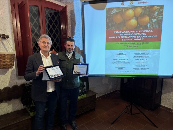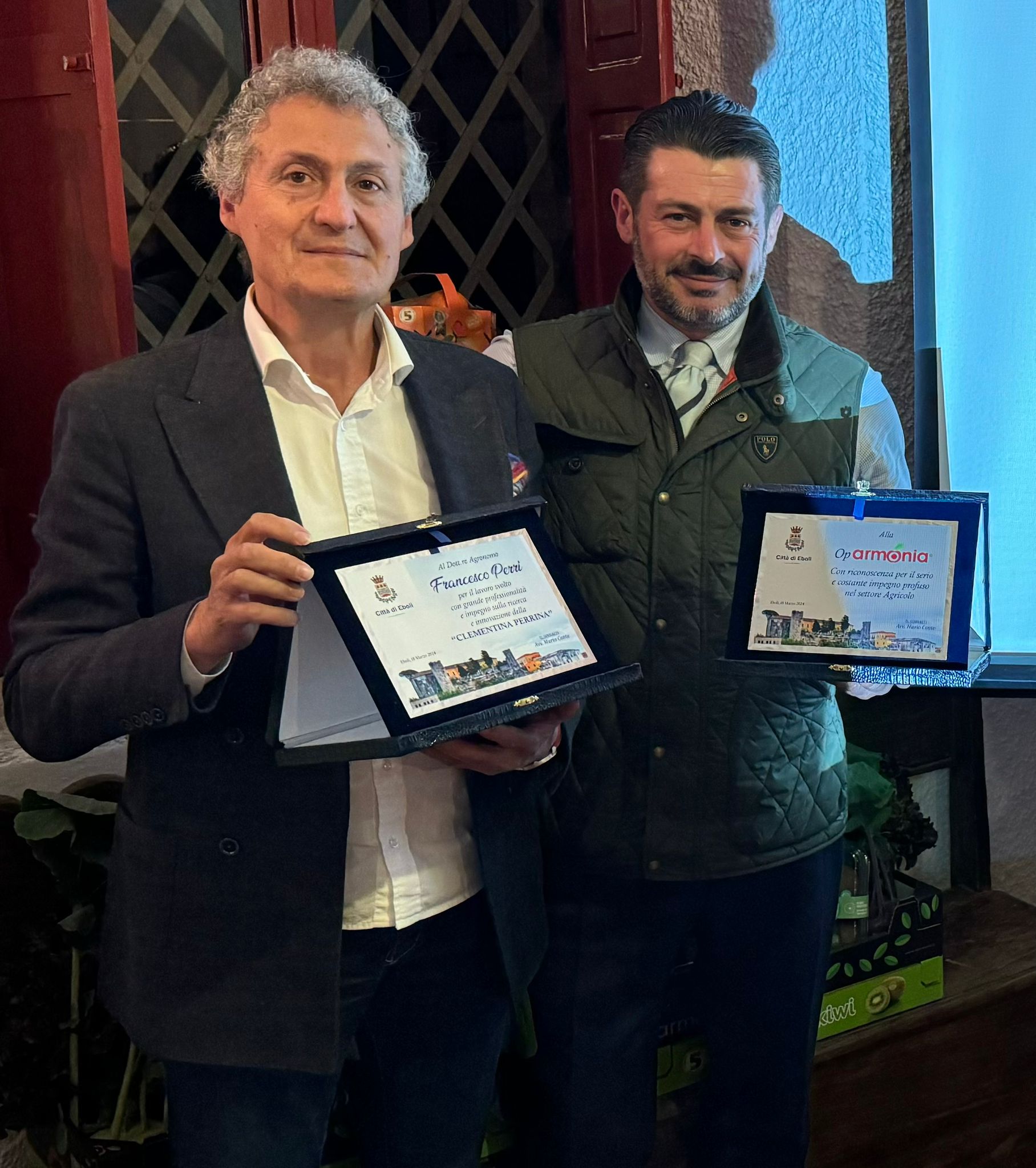 “𝐈𝐧𝐧𝐨𝐯𝐚𝐳𝐢𝐨𝐧𝐞 𝐞 𝐫𝐢𝐜𝐞𝐫𝐜𝐚 𝐢𝐧 𝐀𝐠𝐫𝐢𝐜𝐨𝐥𝐭𝐮𝐫𝐚 𝐩𝐞𝐫 𝐥𝐨 𝐬𝐯𝐢𝐥𝐮𝐩𝐩𝐨 𝐞𝐜𝐨𝐧𝐨𝐦𝐢𝐜𝐨 𝐭𝐞𝐫𝐫𝐢𝐭𝐨𝐫𝐢𝐚𝐥𝐞” è stato il titolo del convegno a seguito del quale i due comuni campani hanno assegnato a Op Armonia e all’agronomo Francesco Perri, padre della nuova varietà di clementina tardiva ribattezzata “Perrina”, il massimo riconoscimento per l’innovazione nel settore dell’agroindustria locale, una delle fonti di maggiore ricchezza della Piana del Sele in Campania.