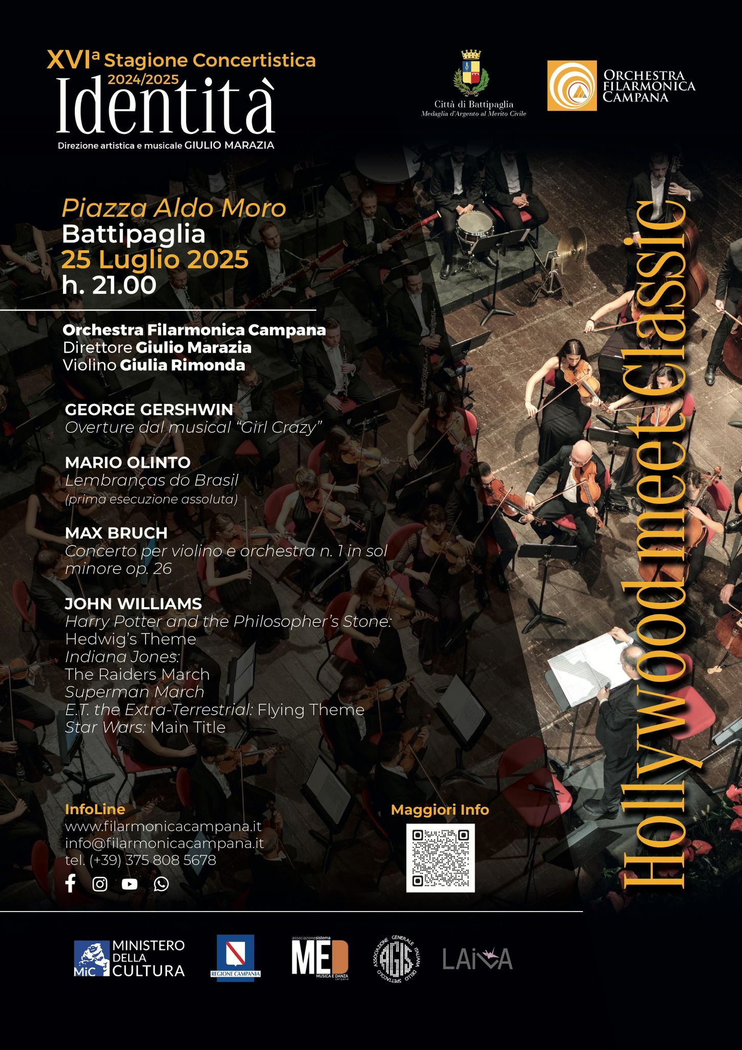 Venerdì 25 Luglio alle ore 21.00, nella piazza Aldo Moro di Battipaglia il concerto dell’Orchestra Filarmonica Campana denominato Hollywood meet Classic.