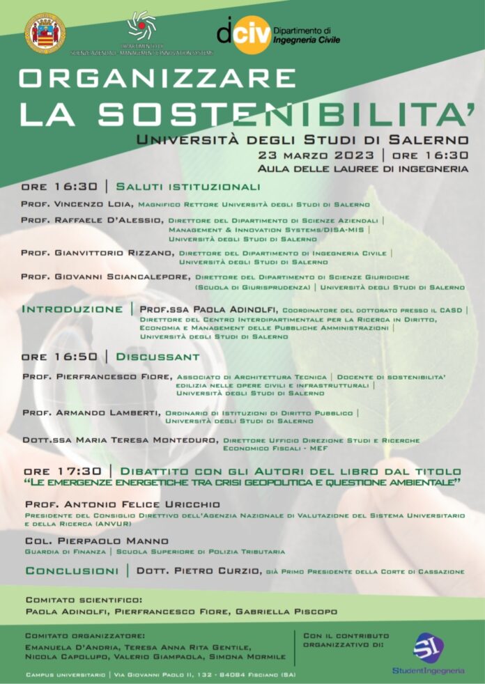 “Organizzare la Sostenibilità” è il titolo del convegno di studi promosso in sinergia dal Centro Interdipartimentale di ricerca di Diritto, Economia e Management delle Pubbliche Amministrazioni CIRPA e dal Dipartimento di Ingegneria Civile DICIV dell’Università degli Studi di Salerno, in programma giovedì 23 marzo alle ore 16.30 presso l’Aula delle Lauree di Ingegneria.