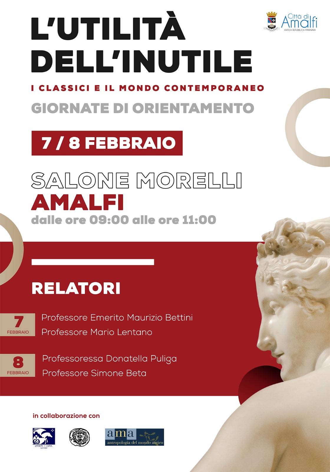 Il prossimo 7 e 8 febbraio 2025 si svolgeranno presso il Salone Morelli di Palazzo di Città le Giornate di Orientamento, dalle ore 9 alle 11. Si tratta di un importante appuntamento culturale, dal titolo “L’Utilità dell’Inutile. I classici e il mondo contemporaneo”: un doppio momento di orientamento e di studio, con lectio magistralis tenute da quattro docenti del “Centro di Ricerca AMA – Antropologia del Mondo Antico” dell’Università di Siena, rivolte agli studenti dell’Istituto di Istruzione Superiore ‘Marini Gioia’ di Amalfi e alla cittadinanza tutta.