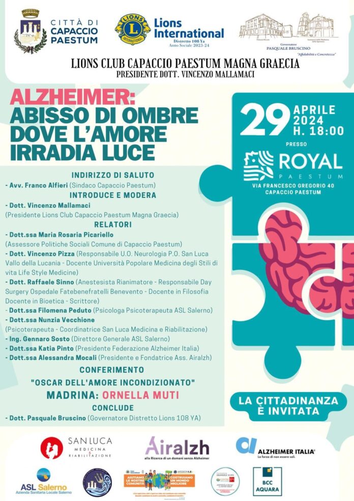 “Alzheimer: abisso di ombre dove l’amore irradia luce” è questo il titolo del convegno organizzato dal Lions Club Capaccio Paestum Magna Grecia, presieduto dal dottor Vincenzo Mallamaci , che si terrà il 29 aprile alle ore 18 presso il Royal Paestum, e che vedrà il conferimento dell’ “Oscar dell’amore incondizionato” che sarà consegnato dalla madrina dell’evento, Ornella Muti .