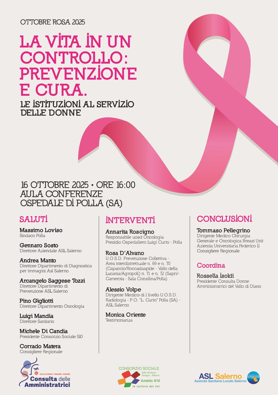Nell’ambito delle iniziative dedicate a Ottobre Rosa, il mese della prevenzione del tumore al seno e della salute della donna, giovedì 16 ottobre 2025, con inizio alle ore 16:00, presso l’Aula Conferenze dell’Ospedale di Polla, si terrà l’incontro dal titolo “La vita in un controllo: prevenzione e cura. Le istituzioni al servizio delle donne”.
