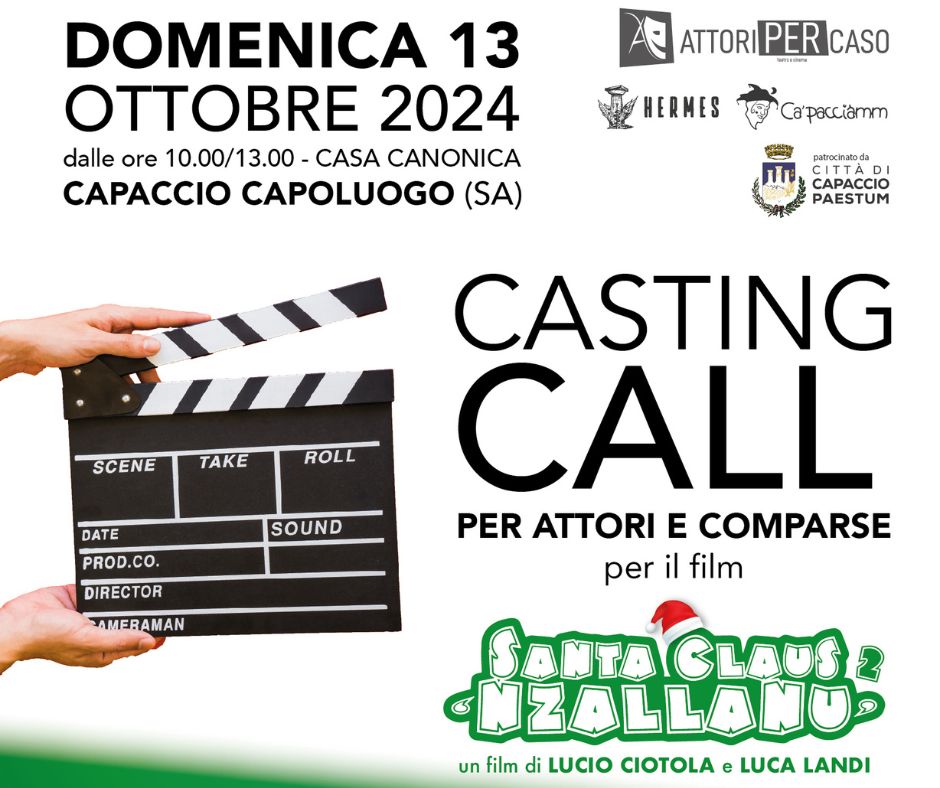 La produzione Attori per Caso è alla ricerca di attori e comparse dai 6 agli 80 anni. Domenica 13 ottobre, dalle ore 10:00 alle ore 13:00, presso la Casa Canonica di Capaccio Capoluogo, si terranno i casting aperti a tutti coloro che desiderano mettersi in gioco e vivere un’esperienza unica davanti alla macchina da presa.
