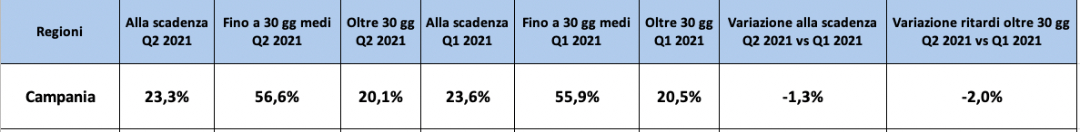 Con il 23,3% di imprese che pagano alla scadenza i propri fornitori, la Campania è terzultima nella classifica italiana stilata dallo Studio Pagamenti di CRIBIS, aggiornato al 30 giugno 2021. Rispetto al trimestre precedente, quando erano il 23,6%, peggiorano i pagamenti puntuali (-1,3%), ma diminuiscono quelli effettuati con ritardi superiori ai 30 giorni, passati dal 20,5% al 20,1% (-2%).