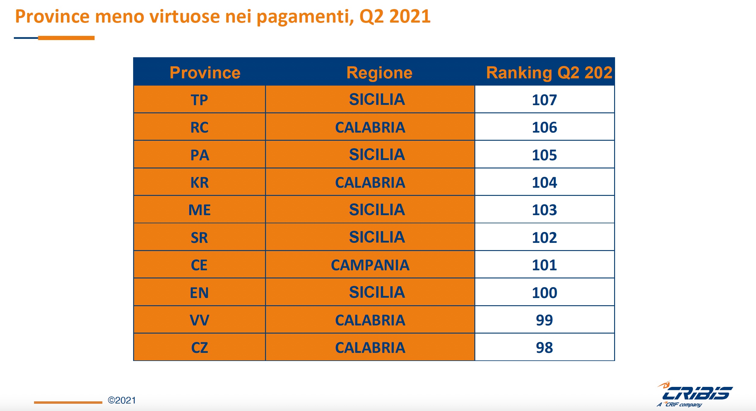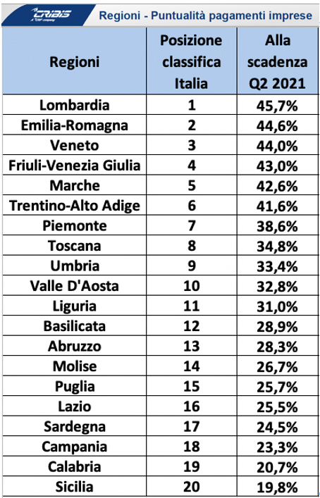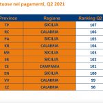 Il ranking regionale della puntualità è guidato dalla Lombardia (45,7%), seguita da Emilia-Romagna (44,6%), Veneto (44%), Friuli – Venezia Giulia (43%) e Marche (42,6%), mentre in ultima posizione troviamo la Sicilia (19,8%), preceduta da Calabria (20,7%) e Campania (23,3%). Sicilia, Calabria e Campania (nell’ordine) detengono inoltre il primato negativo per quanto riguarda i pagamenti oltre i 30 giorni, rispettivamente con il 22,3, il 22,1 e il 20,1%.
