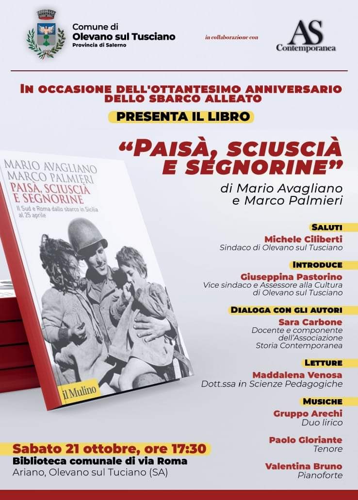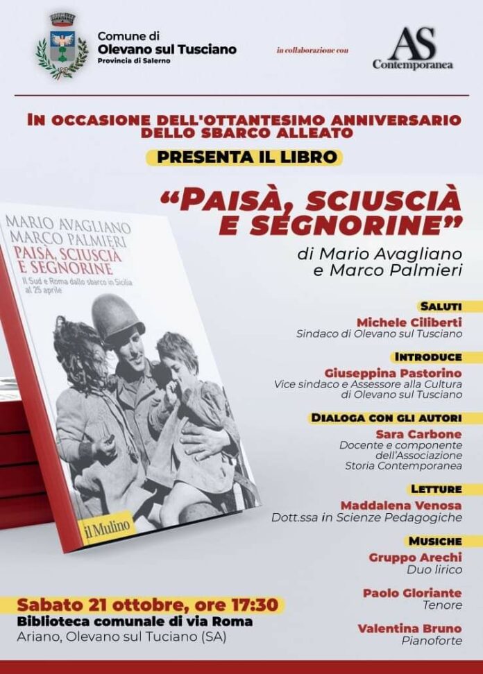 Il peculiare percorso di uscita dalla guerra dell’Italia meridionale è il tema del libro “Paisà, sciuscià e segnorine. Il Sud e Roma dallo sbarco in Sicilia al 25 aprile (Il Mulino), di Mario Avagliano e Marco Palmieri, che raccontano questo periodo attraverso una pluralità di fonti coeve: lettere, diari, corrispondenza censurata, relazioni delle autorità italiane e alleate, giornali, canzoni, film.