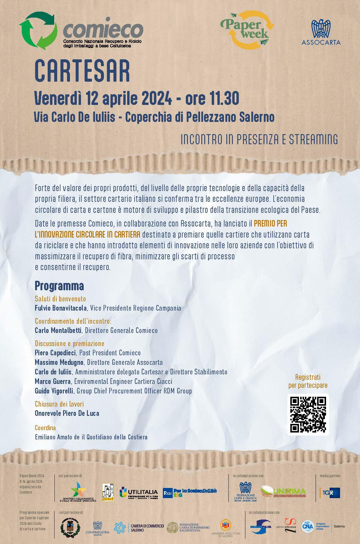 Interverranno: Francesco Morra Sindaco di Pellezzano, Mariateresa Imparato Presidente Legambiente Campania, Fulvio Bonavitacola Vice Presidente Regione Campania, Carlo Montalbetti Direttore Generale Comieco, Massimo Medugno Direttore Generale Assocarta, Piero Capodieci Past President Comieco, Carlo de Iuliis Amministratore delegato Cartesar e Direttore Stabilimento, Marco Guerra Enviromental Engineer Cartiera Ciacci, Guido Vigorelli Group Chief Procurement Officer RDM Group. La chiusura dei lavori sarà affidata all’onorevole Piero De Luca, coordina Emiliano Amato Il quotidiano della Costiera.
