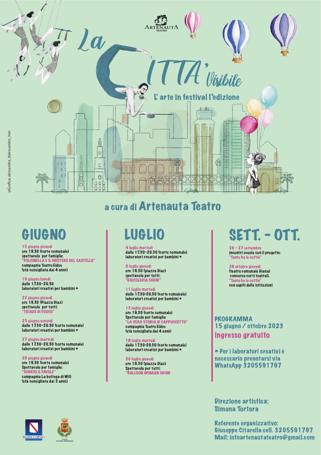 «Cultura inclusiva e teatro per tutti» è il messaggio lanciato dalla nuova rassegna estiva “La città visibile-L’Arte in festival” targata Artenauta Teatro, rivolta a bambini e ragazzi, ma anche ad adulti, famiglie ed appassionati d’arte e teatro. 3 location (Piazza Diaz, Corte comunale, Teatro Diana), 6 spettacoli, eventi di giocoleria e laboratori per piccoli, il concorso per cortometraggi teatrali e 2 incontri/convegni con le scuole. Sono i numeri del nuovo progetto culturale ideato dalla direttrice artistica e regista Simona Tortora, con l’organizzazione di Giuseppe Citarella, il patrocinio del Comune di Nocera Inferiore e il sostegno della Regione Campania. La rassegna si svolgerà dal 15 giugno al 26 ottobre 2023.
