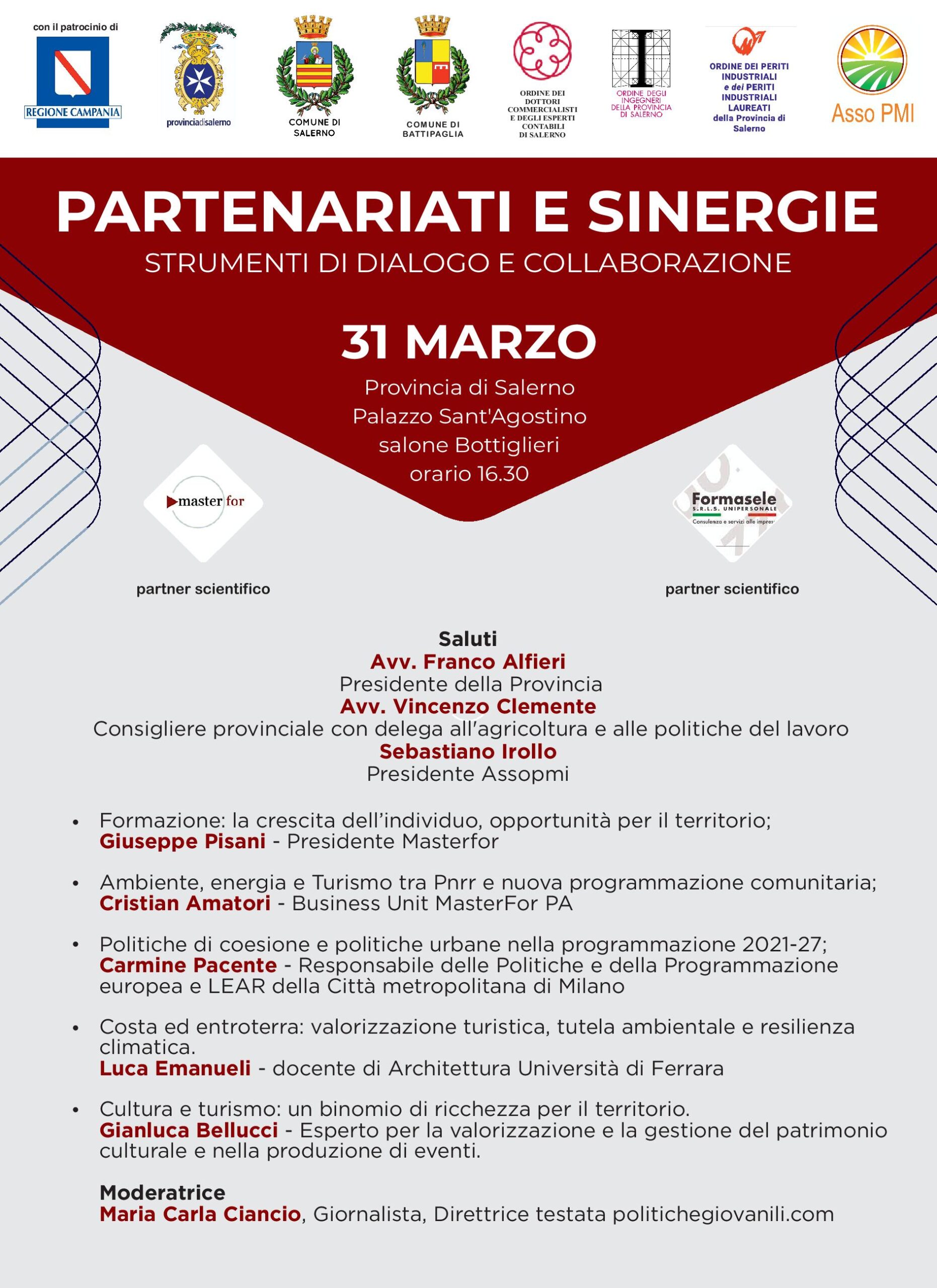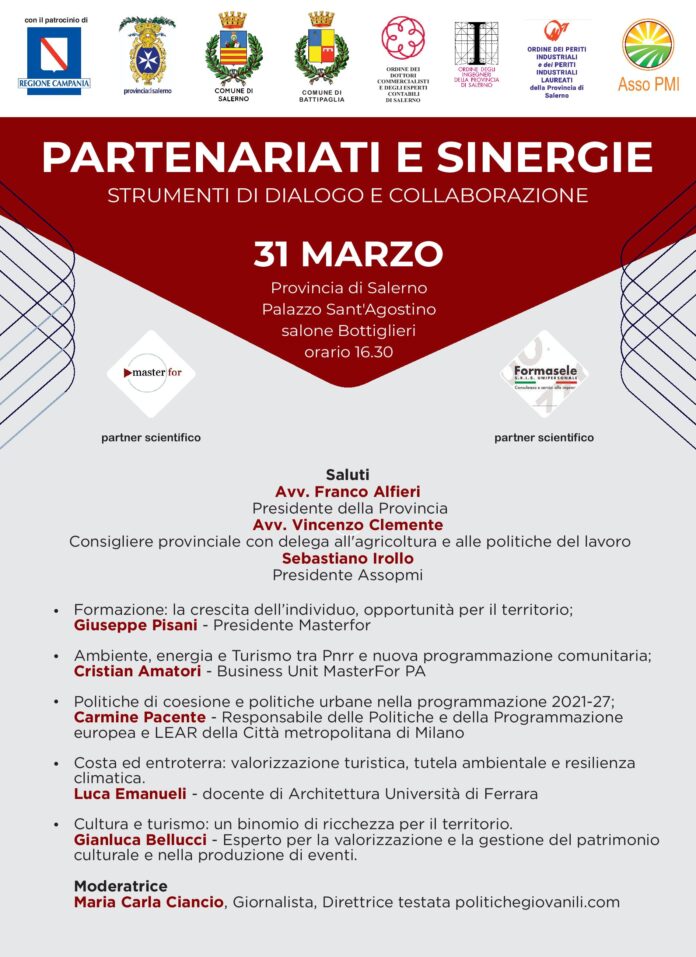 “Partenariati e sinergie – strumenti di dialogo e collaborazione” è il titolo del convegno che si terrà nel Salone Bottiglieri di Palazzo Sant’Agostino – sede della Provincia di Salerno, Venerdì 31 Marzo alle 16.30