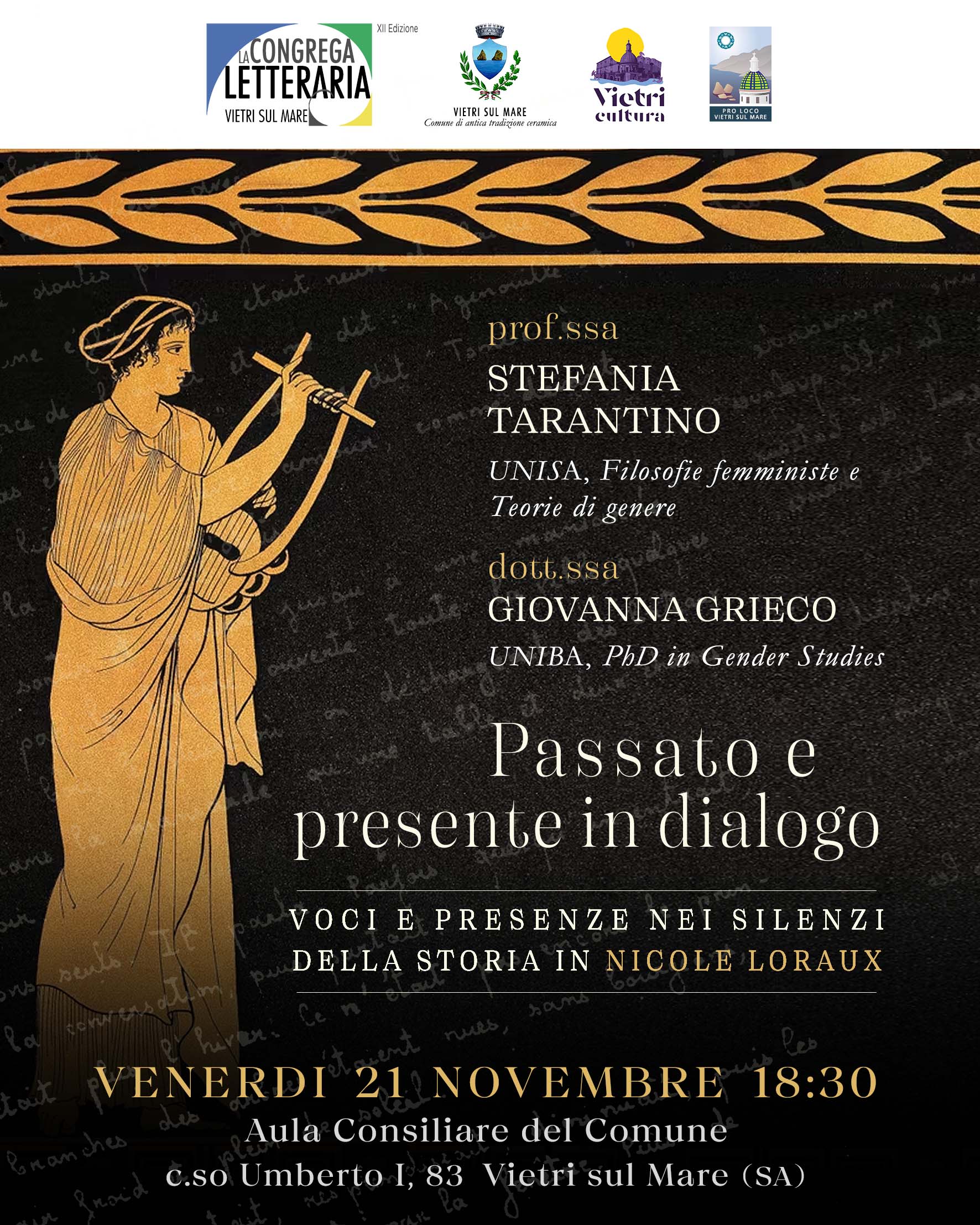 Nell’ambito della XII edizione degli Incontri di cultura, l’associazione culturale di Vietri sul Mare “La Congrega Letteraria” invita alla lectio magistralis: “PASSATO E PRESENTE IN DIALOGO: voci e presenze nei silenzi della storia in NICOLE LORAUX”, per una serata dedicata alla Filosofia della Storia e agli studi femministi.