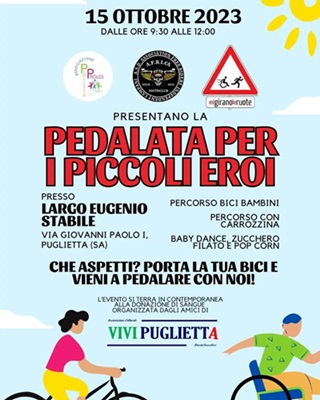 Si terrà domenica 15 ottobre, dalle ore 09.30 alle 12.30, a Campagna (SA) presso la frazione di Puglietta in via Giovanni Paolo I, l’iniziativa denominata “Pedalata dei piccoli eroi”. promossa dall’associazione “Puglietta Proles” in collaborazione con “Asd “Africa” un gruppo di motociclisti per i piccoli eroi, associazione culturale Vivi Puglietta” e dall’Aps “Mi girano le ruote”.