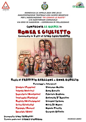 Una manifestazione teatrale a scopo benefico per raccogliere fondi da devolvere in favore dell’associazione “Mi girano le ruote” presieduta da Vitina Maioriello. Lo spettacolo si terrà domenica 21 aprile presso l’Auditorium Comunale di Pellezzano sito in via Eroi di Nassirya, nella frazione Coperta. Salirà sul palco la compagnia “Le Querce” che porterà in scena il lavoro teatrale di Gino Cogliandro intitolato “Romea e Giulietto” per la regia di Anna Aurelio e Fabrizio Avallone.