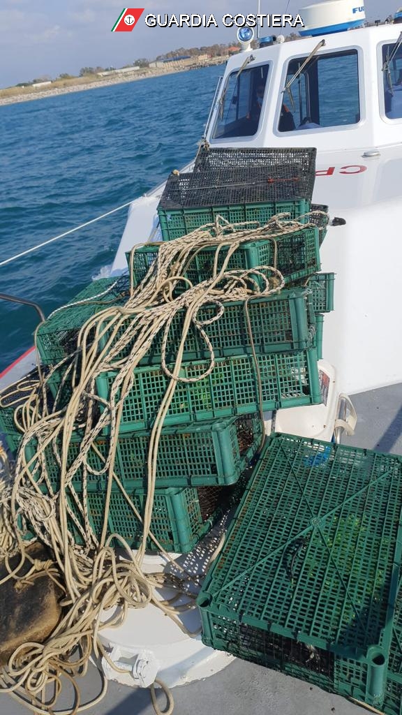 Gli attrezzi, costituiti da rudimentali cassette in plastica, erano collegati ad una cima di circa 300 metri assicurata al fondale mediante due pesi in cemento e segnalati da bottiglie per agevolarne il recupero e renderne difficile l’individuazione da parte degli organi di vigilanza.