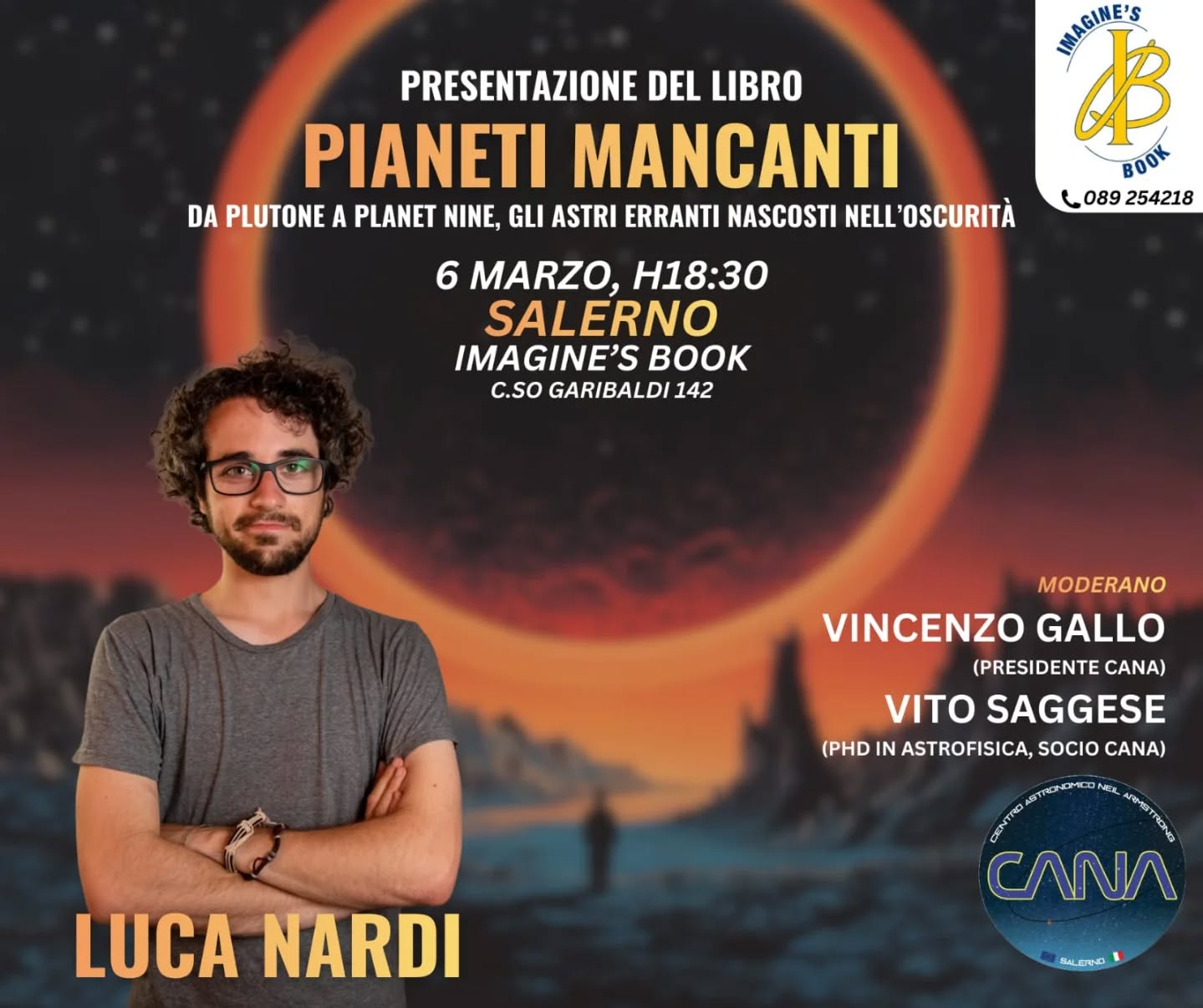 L’evento si terrà presso la libreria Imagine’s Book di Salerno. A coordinare la presentazione saranno il Presidente del CANA, Avv. Vincenzo Gallo e il Dr. Vito Saggese, Socio del CANA e Dottore di Ricerca in Astrofisica.