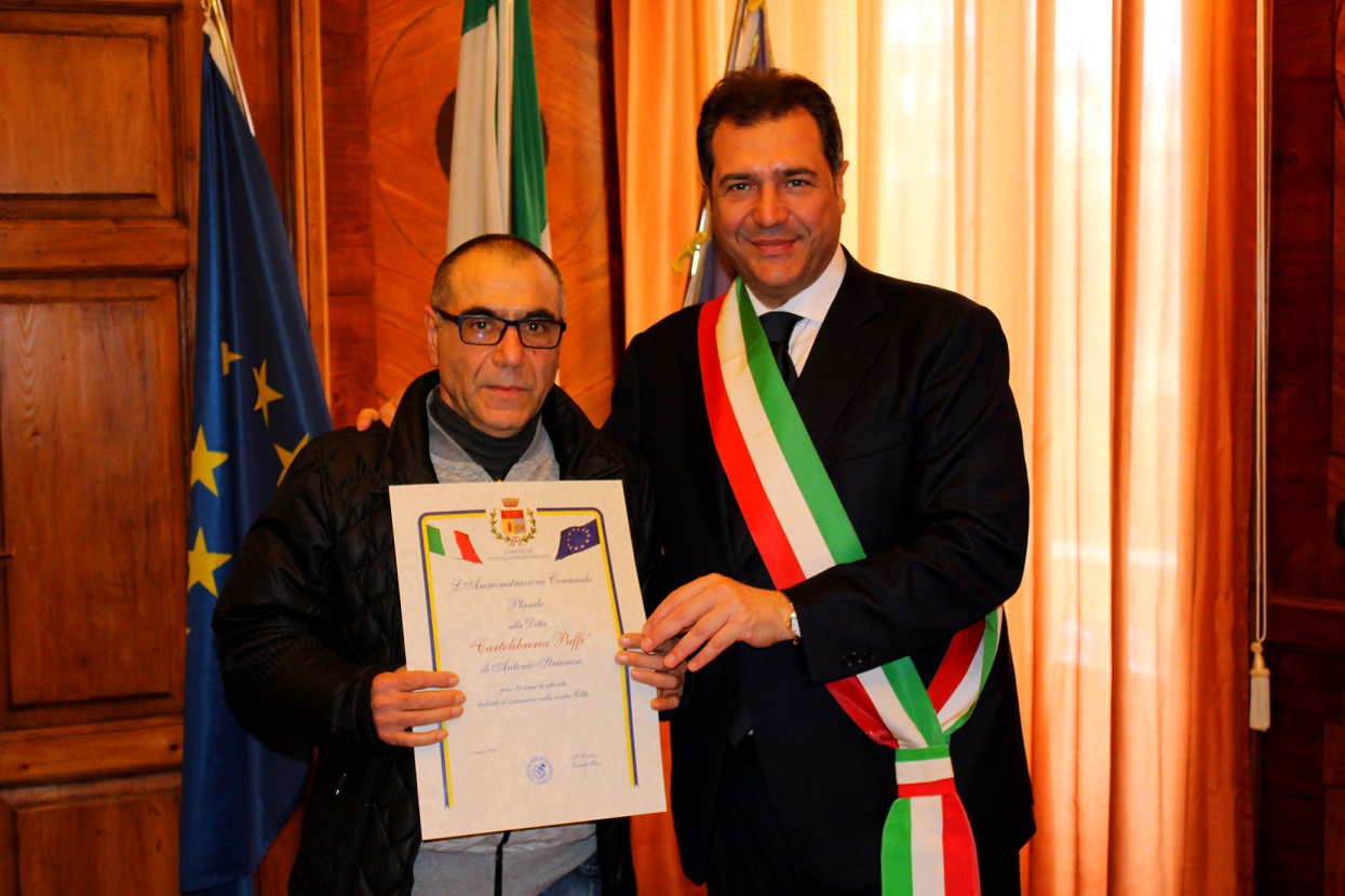 “Alla Ditta ‘Cartolibreria Puffi’ di Antonio Strianese per i 35 anni di attività dedicati al commercio nella nostra Città”;