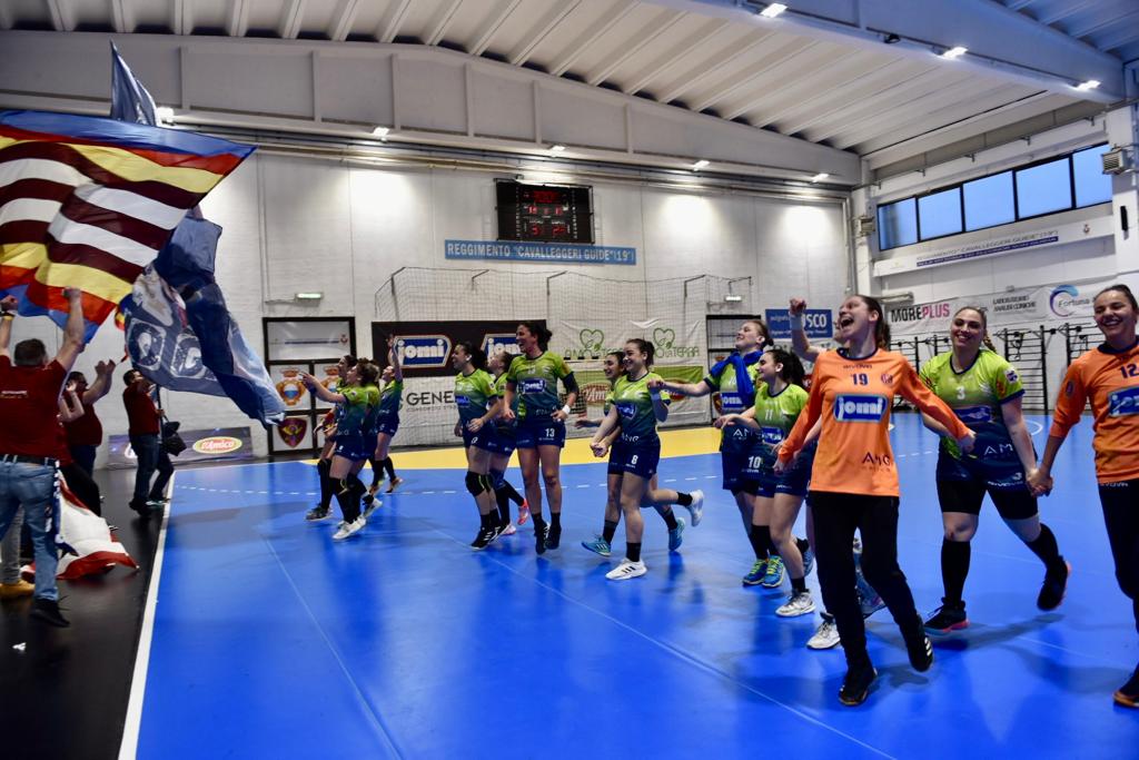 Esattamente come accaduto lo scorso mercoledì al PalaSport Marica Bianchi di Pontinia, il primo tempo della Palumbo tra le formazioni di Ancona e Laera è all’insegna dell’equilibrio. La Jomi Salerno, forte del sostegno del proprio pubblico accorso numeroso per spingere la squadra in un match sentitissimo, apre le marcature. Il doppio vantaggio delle padrone di casa è firmato da Ilaria Dalla Costa che, assente l’esperta Pina Napoletano, indossa la fascia di capitano, e Giulia Rossomando. Tra le due reti delle salernitane, la parata di Pereira che impedisce a Marinela Panayotova di trovare la via del gol al minuto 2. Solo al quarto minuto di gioco le ospiti mettono in rete il primo pallone. Si apre così una gara combattuta tra le formazioni in campo e, per il primo quarto, dominata dall’equilibrio. È poi la Jomi Salerno ad ingranare la marcia e a provare a realizzare il primo strappo del match. Guidata dalle reti di Dalla Costa, Matos e Squizziato, la formazione allenata da Francesco Ancona realizza il massimo vantaggio al minuto 25 con il gol proprio della numero 9 che porta il risultato sul 12 – 7. La squadra di Antonj Laera non si arrende e, infatti, prova a recuperare riuscendo a chiudere il primo tempo sul risultato di 13 – 10. Nella seconda frazione la Jomi Salerno mette in campo motivazioni e voglia di raggiungere l’obiettivo della stagione. L’ottima prestazione di Rocio Squizziato e ancora di Cyrielle Lauretti Matos consente alle atlete allenate da Francesco Ancona di mettere maggiore distanzasulle ospiti. Prima la rete di Rossomando a cinque minuti dalla conclusione per un vantaggio di 7 sulla squadra di Laera e Nasta, poi quella dopo pochi secondi di Lauretti Matos che porta le salernitane al massimo vantaggio: +8 al minuto 27. È poi, ancora, Giulia Rossomando dai 7 metri a chiudere la gara sul 31 – 23.