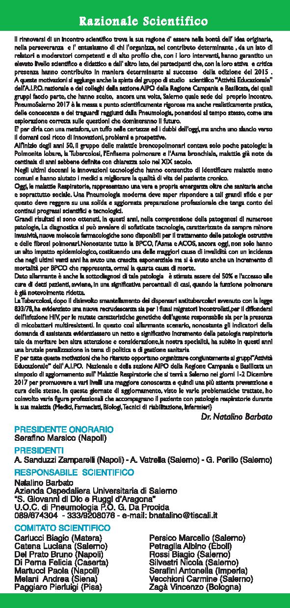 Secondo il promotore dell’iniziativa, dott. Natalino Barbato, direttore U.O.C. di Pneumologia -P.O. “G.Da Procida” di Salerno: “ all’inizio degli anni Cinquanta il gruppo delle malattie broncopolmonari contava solo poche patologie. Negli ultimi decenni le innovazioni tecnologiche hanno consentito di identificare malattie meno comuni e hanno aiutato i medici a migliorare la qualità di vita del paziente cronico. Oggi le malattie respiratorie rappresentano una vera e propria emergenza oltre che sanitaria anche e soprattutto sociale. Una pneumologia moderna deve saper rispondere a tali grandi sfide e per questo deve reggere su una solida e aggiornata preparazione professionale che tenga conto dei continui progressi scientifici e tecnologici”.