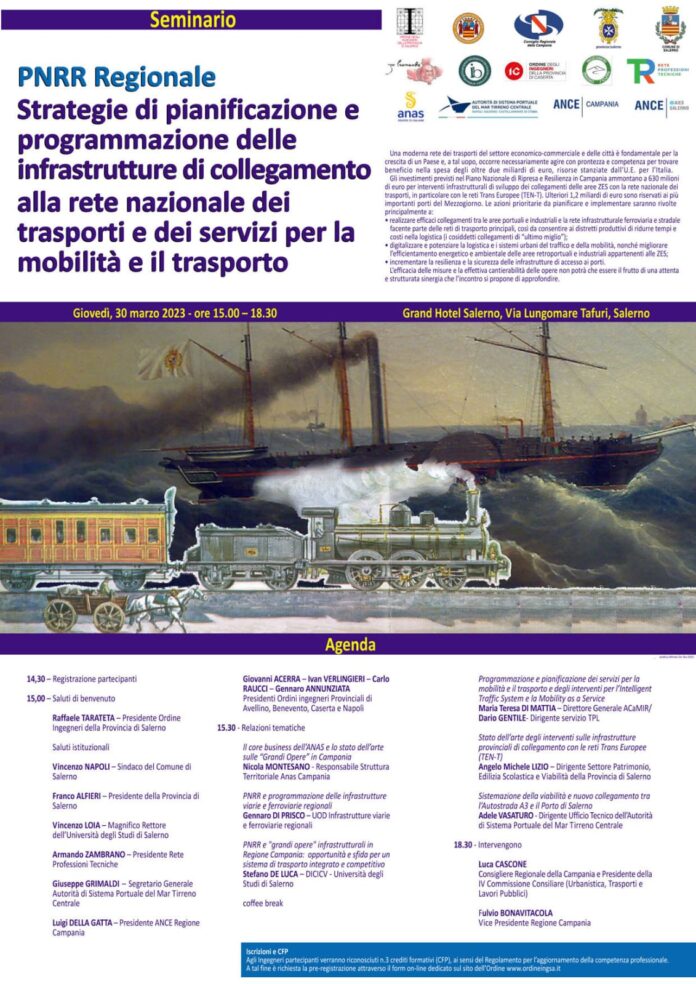 Si terrà, giovedì 30 marzo alle ore 15, presso il Grand Hotel Salerno, in via Lungomare Tafuri, il seminario, organizzato dall’Ordine degli Ingegneri della provincia di Salerno, sul tema “Pnrr regionale, strategie di pianificazione e programmazione delle infrastrutture di collegamento alla rete nazionale dei trasporti e dei servizi per la mobilità e il trasporto”. Una moderna rete dei trasporti del settore economico-commerciale e delle città è fondamentale per la crescita di un paese. A tal uopo, occorre necessariamente agire con prontezza e competenza per trovare beneficio nella spesa degli oltre 2 miliardi di euro di risorse stanziate dall’ U.E. per l’Italia. Gli investimenti previsti nel Piano Nazionale di Ripresa e Resilienza in Campania ammontano a 630 milioni di euro per interventi infrastrutturali di sviluppo dei collegamenti delle aree Zes con la rete nazionale dei trasporti, in particolare con le reti Trans Europee (TEN-T). Ulteriori 1,2 miliardi di euro sono riservati ai più importanti porti del Mezzogiorno. Le azioni prioritarie da pianificare e implementare saranno rivolte principalmente a: realizzare efficaci collegamenti tra le aree portuali e industriali e la rete infrastrutturale ferroviaria e stradale facente parte delle reti di trasporto principali, così da consentire ai distretti produttivi di ridurre tempi e costi nella logistica (i cosiddetti collegamenti di ultimo “miglio”);