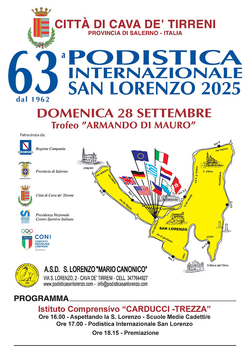La partecipazione di atleti di spessore internazionale, varie competizioni in programma, la presenza del cestista Francesco Longobardi in veste di “testimonial” e di “Sportivo cavese dell’anno”, la consueta entusiastica cornice di pubblico: tutto pronto per la 63ª edizione della “Podistica Internazionale San Lorenzo” – Trofeo Armando Di Mauro, in programma domenica 28 settembre 2025 a Cava de’ Tirreni (SA) con partenza ed arrivo in località San Lorenzo.