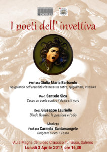 Lunedì 3 aprile p.v. alle ore 16,30, nell’Aula Magna del Liceo Tasso di Salerno si terrà un incontro letterario a cura dell’Associazione Culturale Adorea incentrato sul tema “I poeti dell’invettiva”.