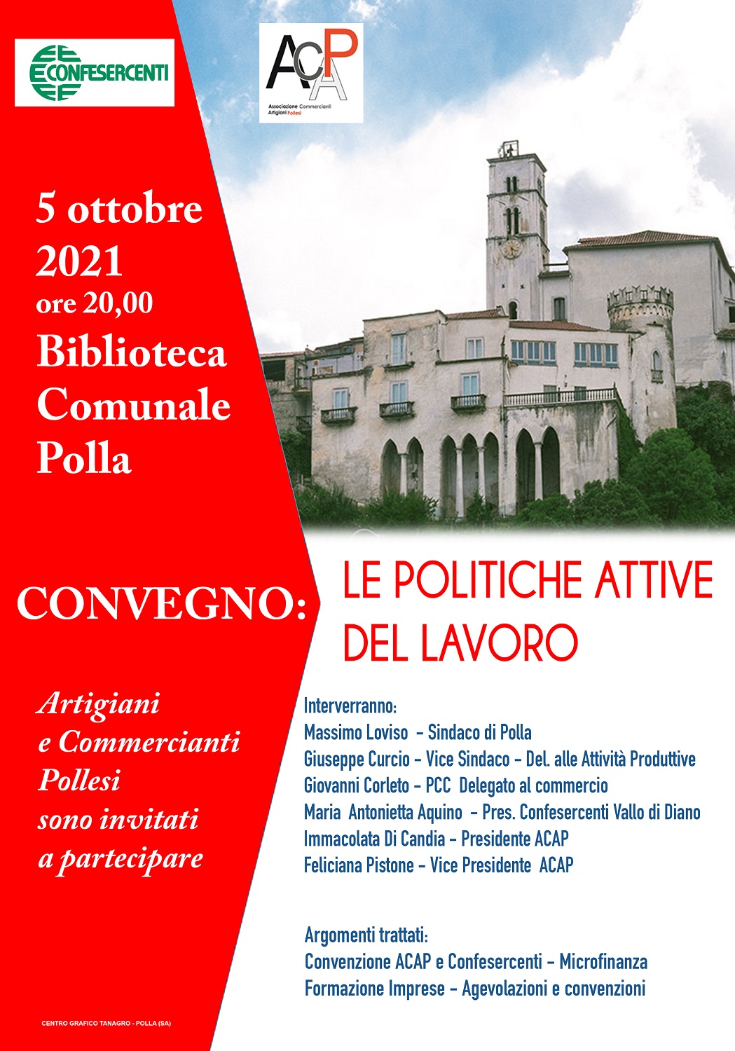 Si terrà domani, 5 ottobre, dalle ore 20,00, presso la Biblioteca Comunale di Polla, un convegno dal titolo “Le politiche attive del lavoro”, promosso dall’Acap, associazione commercianti e artigiani di Polla, in collaborazione con il comune di Polla e la partecipazione della Confesercenti Vallo di Diano.