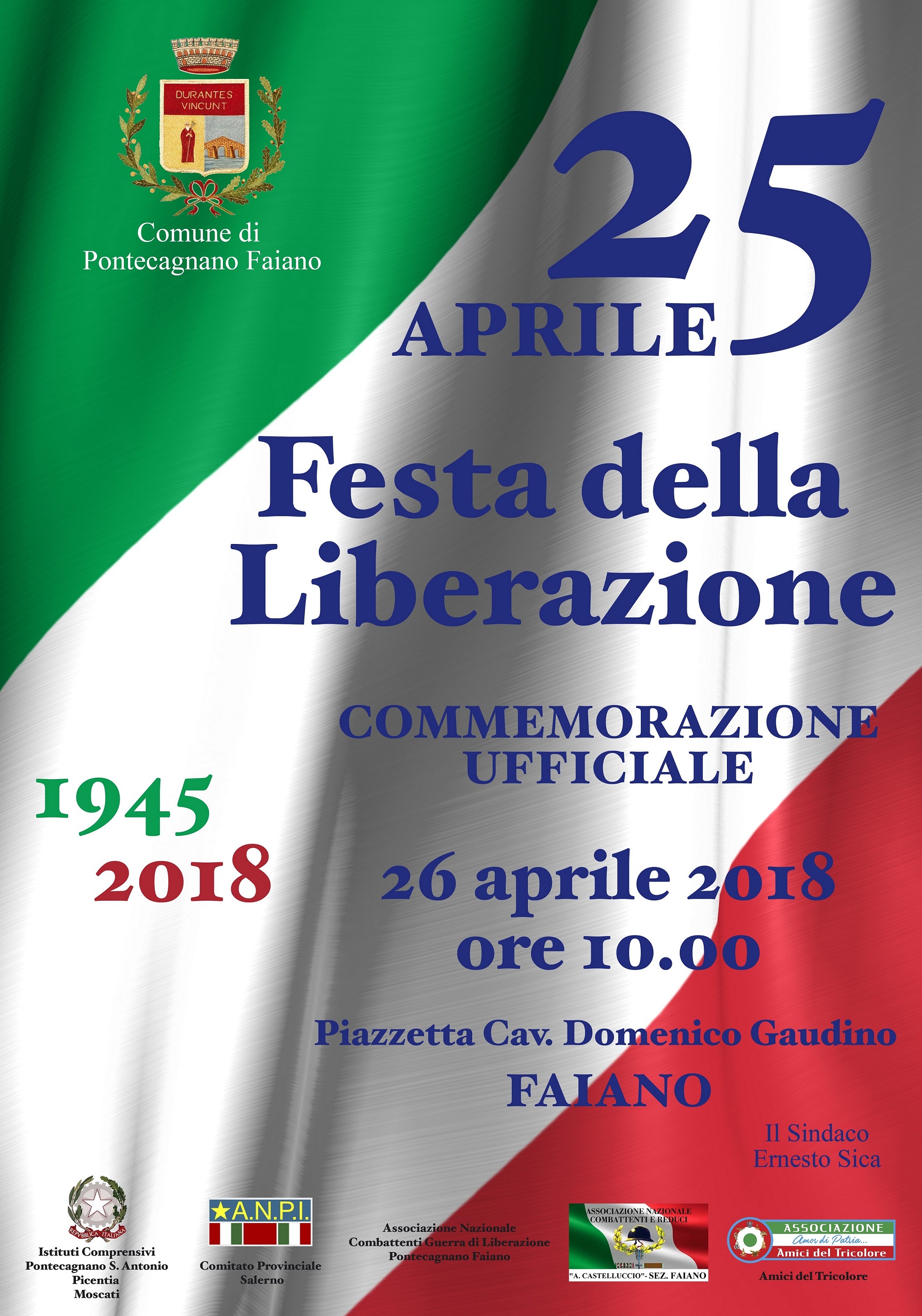 La cerimonia, che si terrà giovedì 26 aprile, alle ore 10, in Piazzetta “Cav. Domenico Gaudino” a Faiano, è stata organizzata dall’Amministrazione guidata dal Sindaco Ernesto Sica con la partecipazione degli Istituti Comprensivi cittadini, del Comitato provinciale di Salerno dell’Anpi, dell’Associazione Nazionale Combattenti Guerra di Liberazione di Pontecagnano Faiano, dell’Associazione Nazionale Combattenti e Reduci “A. Castelluccio” sezione di Faiano, dell’Associazione Amici del Tricolore.