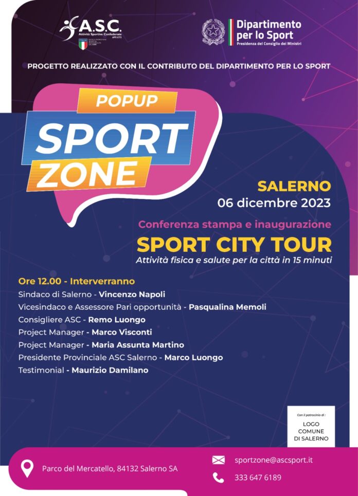 Sarà inaugurata mercoledì 6 dicembre la prima Popup Sport Zone di Salerno, realizzata nell’ambito del progetto promosso da ASC Attività Sportive Confederate, con il contributo del Dipartimento per lo Sport. Gli obiettivi delle Popup Sport Zone sono quelli di migliorare la qualità di vita dei cittadini, contribuire a generare modelli urbani sostenibili, favorire la diffusione della pratica sportiva come strumento di socialità, inclusione e salvaguardia della salute.