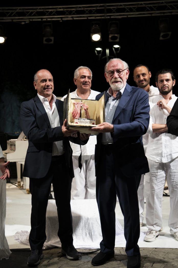 Subito dopo l’attrice Martina Carpi ha invitato sul palco Renato Carpentieri a cui la giuria di giornalisti ha assegnato il premio Annibale Ruccello che quest’anno consisteva in una scultura del maestro Lino Fiorito.