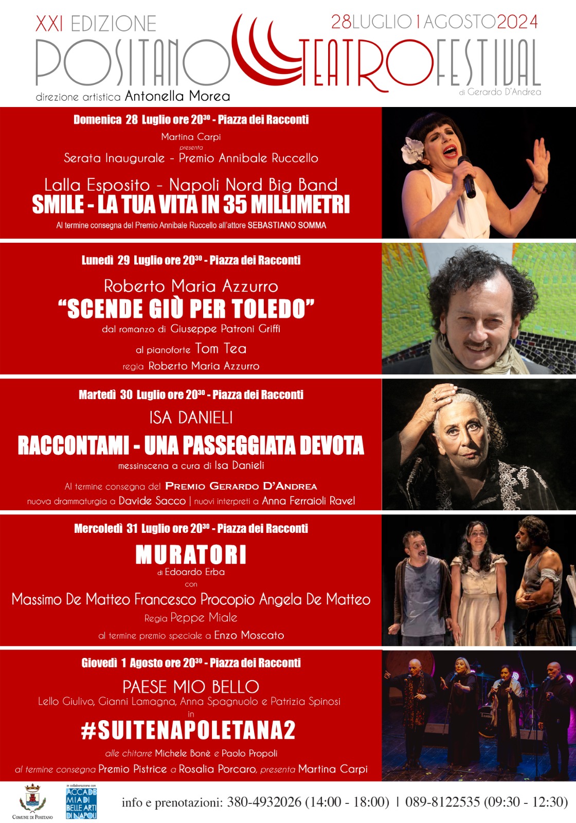 L’apertura è affidata al gradito ritorno di Lalla Esposito, la cantante attrice tanto cara al Positano Teatro Festival che si esibirà con la Napoli Nord Big Band nell’originale spettacolo musicale “SMILE” La tua vita in 35 millimetri. La sua speciale voce sarà accompagnata dalla corposa Big Band composta da Nicola Rando, Salvatore Marchese, Luciano Bellino, Fabiano Pappalardo, Lello Palma (sassofoni), Peppe Fiscale, Nicola Di Donna, Fabrizio Di Vaio, Angelo Cioffi, Lorenzo Federici (trombe e Filicorni), Domenico Brasiello, Enzo Vuolo, Matteo Rivieccio, Antonio Di Somma (tromboni) Antonio Ottaviano (pianoforte e fisarmonica), Enzo Amazio (chitarra), Davide Costagliola (basso), Carmine Mattia Marino (batteria), Domenico Monda (percussioni), Giuseppe Di Colandrea (maestro concertatore), Mimmo Napolitano (arrangiamenti e trascrizioni), fonica Daniele Piscicelli, supervisore Luigi Di Martino.